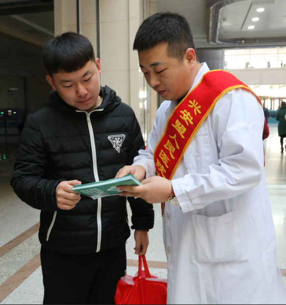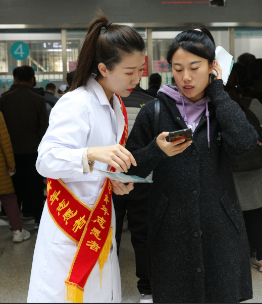 13名志愿者身披彩带分别在门诊大厅、超声科、检验科等人群密集区域向过往群众宣传、指导预约挂号系统的下载和使用方法,并热情的为患者及家属导诊、发放健康知识手册,此举有效的缓解了挂号压力,缩短了患者就诊排队等候时间,提高了门诊服务质量。