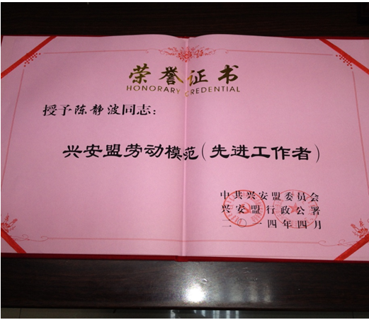 2014年4月29日上午在盟委报告厅召开的“全盟庆祝五一国际劳动节暨劳动模范和先进工作者表彰大会上,我院儿科护士陈静波同志获得了兴安盟“劳动模范”荣誉称号。