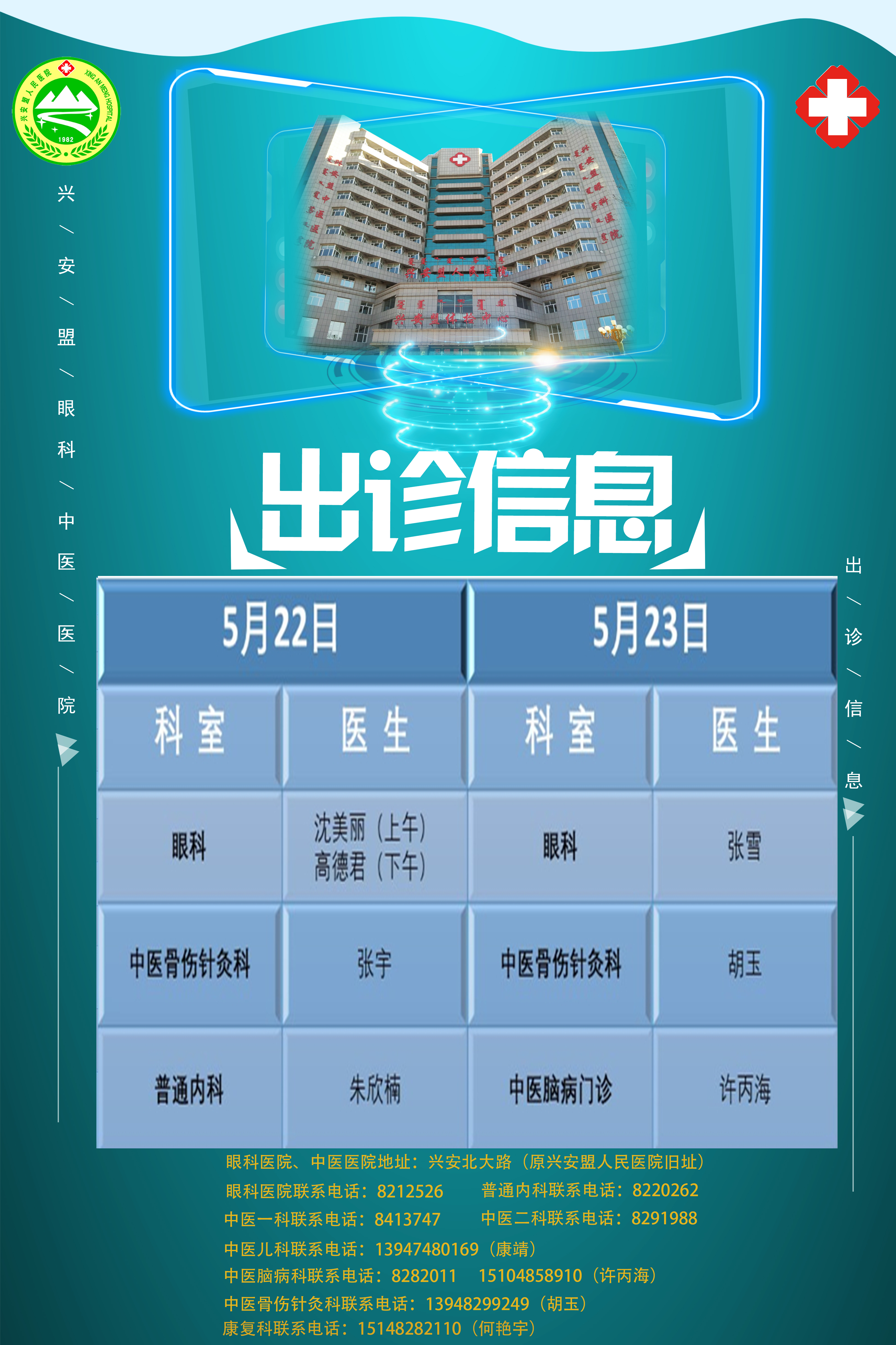 2021年5月22日至23日中医院、眼科医院门诊出诊信息
