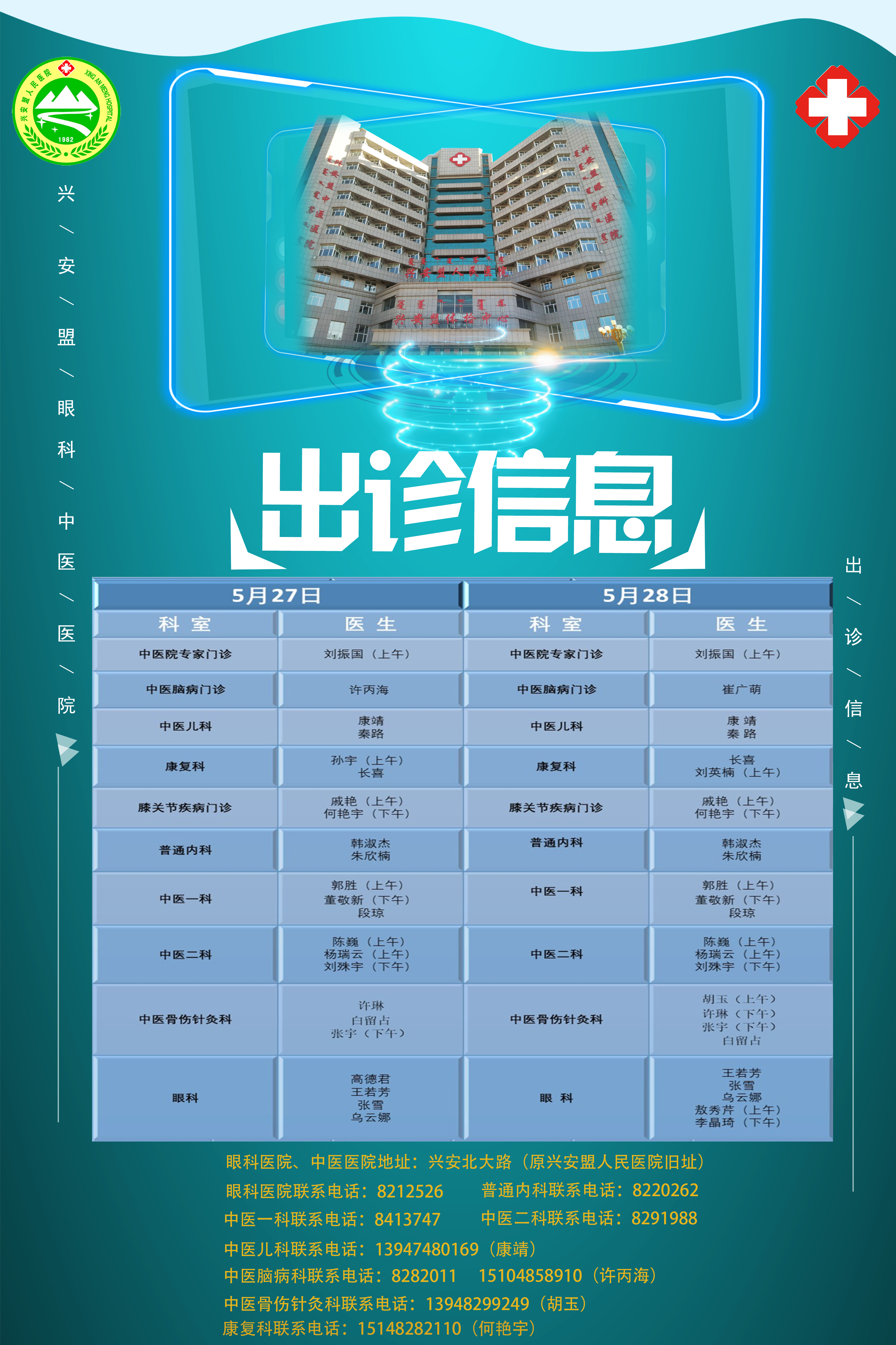 2021年5月27日至28日中医院、眼科医院门诊出诊信息