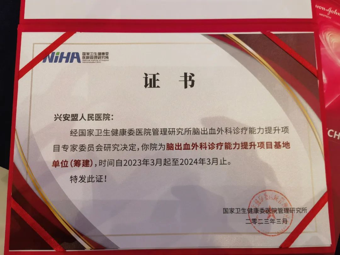兴安盟人民医院神经外科团队经过申请、专家组综合评审,凭借精湛的诊疗技术、雄厚的人员资质团队、先进的硬件配置等成功入选国家级脑出血外科诊疗能力提升项目基地。