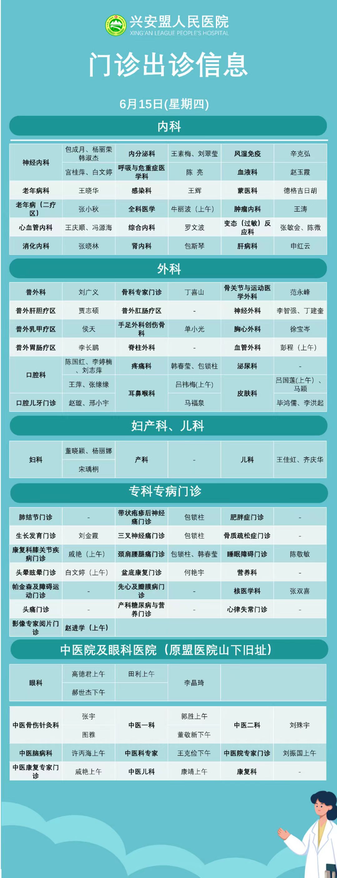 『出诊信息』盟人民医院6月19日-6月23日门诊出诊信息