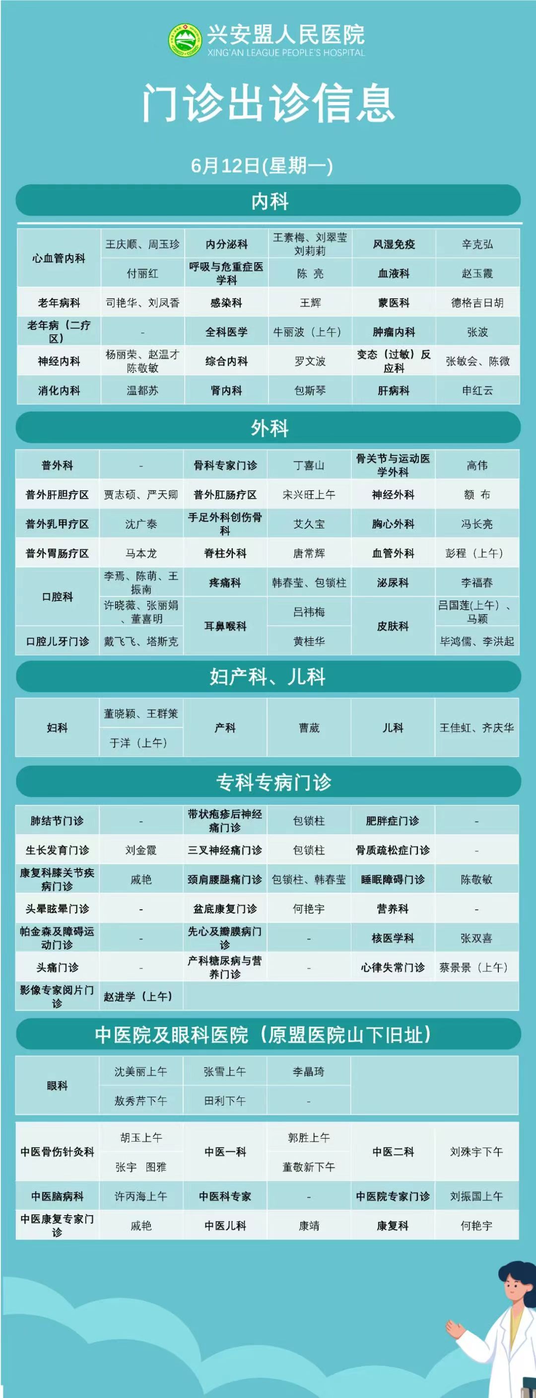 『出诊信息』盟人民医院6月12日-6月16日门诊出诊信息