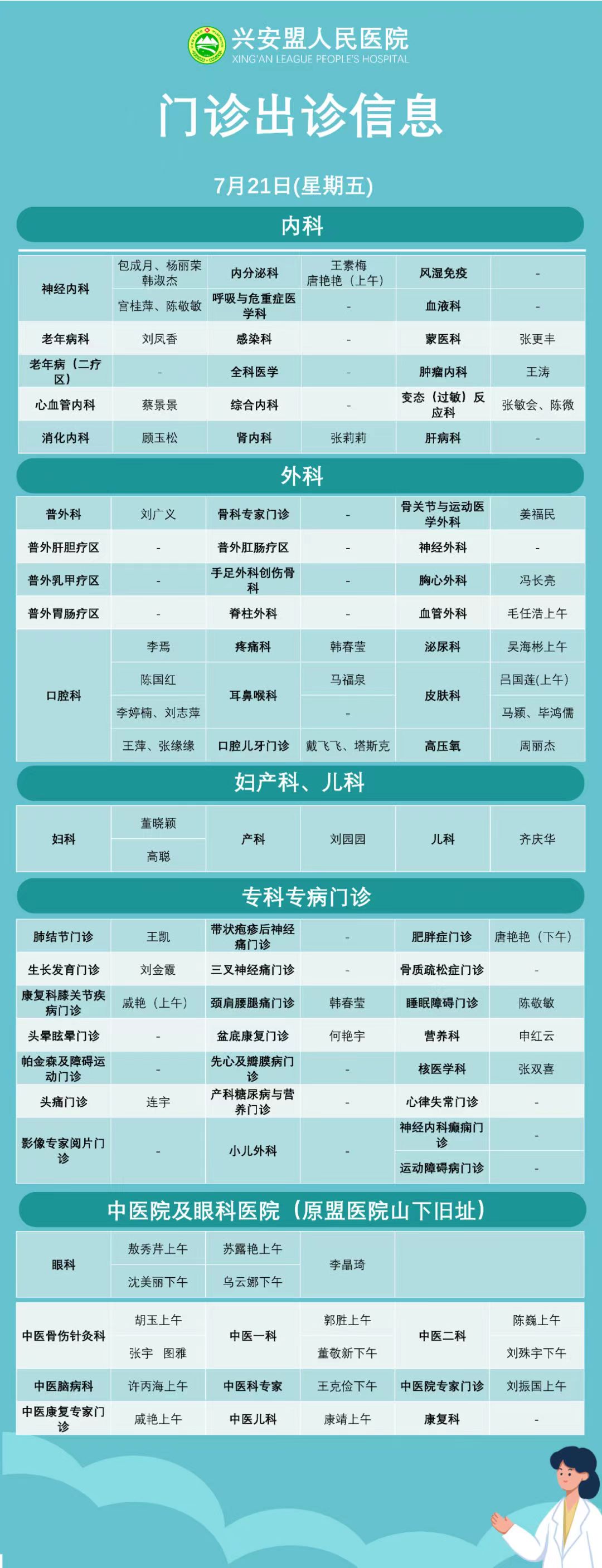 『出诊信息』盟人民医院7月17日-7月21日门诊出诊信息