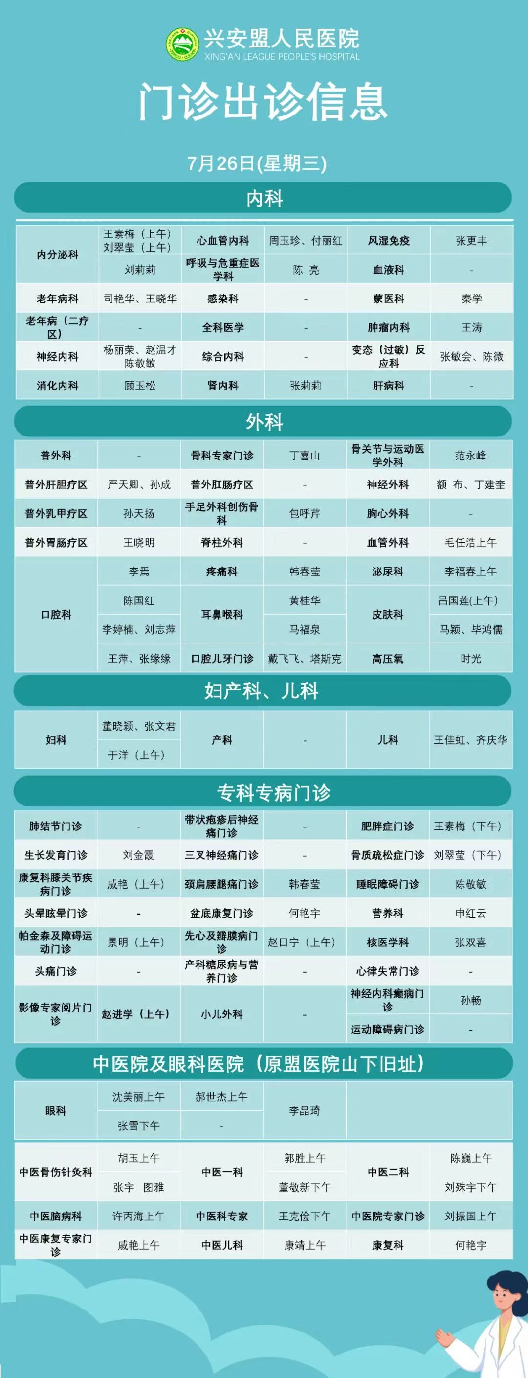 『出诊信息』盟人民医院7月17日-7月21日门诊出诊信息