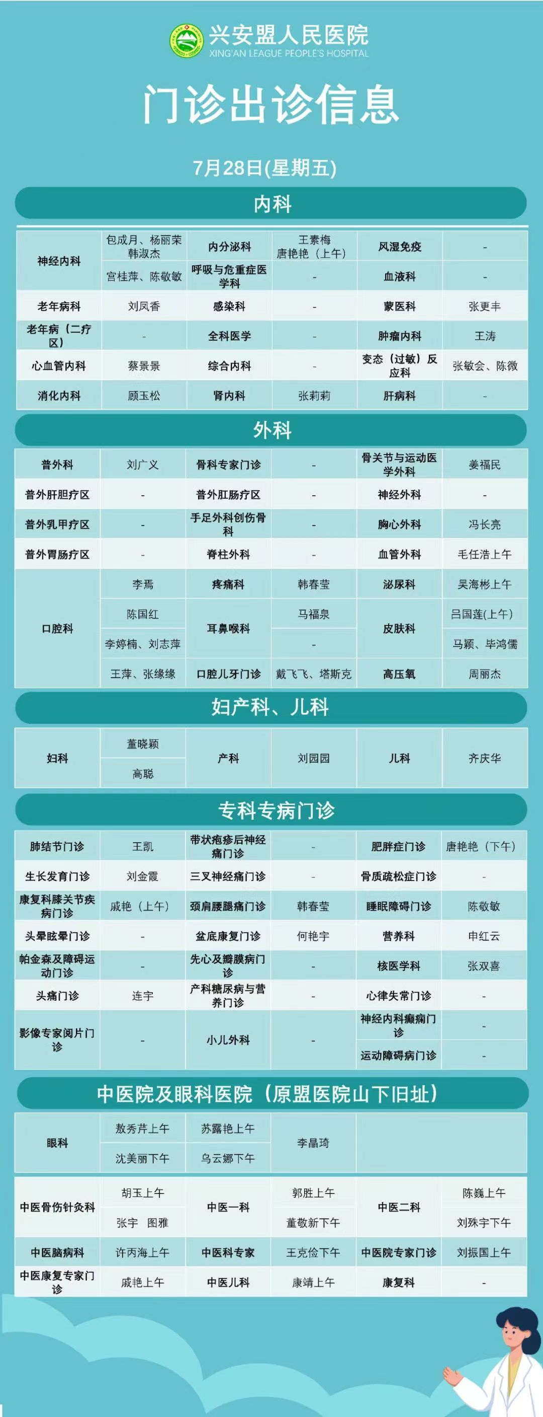 『出诊信息』盟人民医院7月24日-7月28日门诊出诊信息