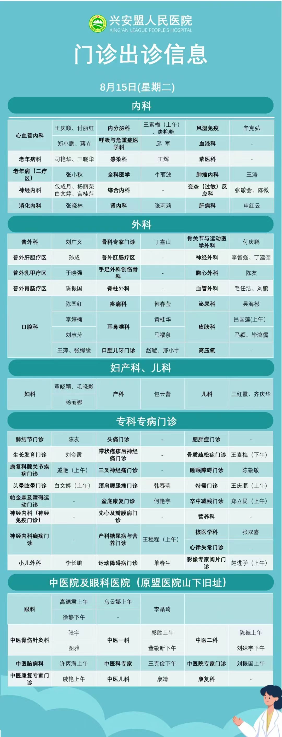 『出诊信息』盟人民医院8月14日-8月18日门诊出诊信息