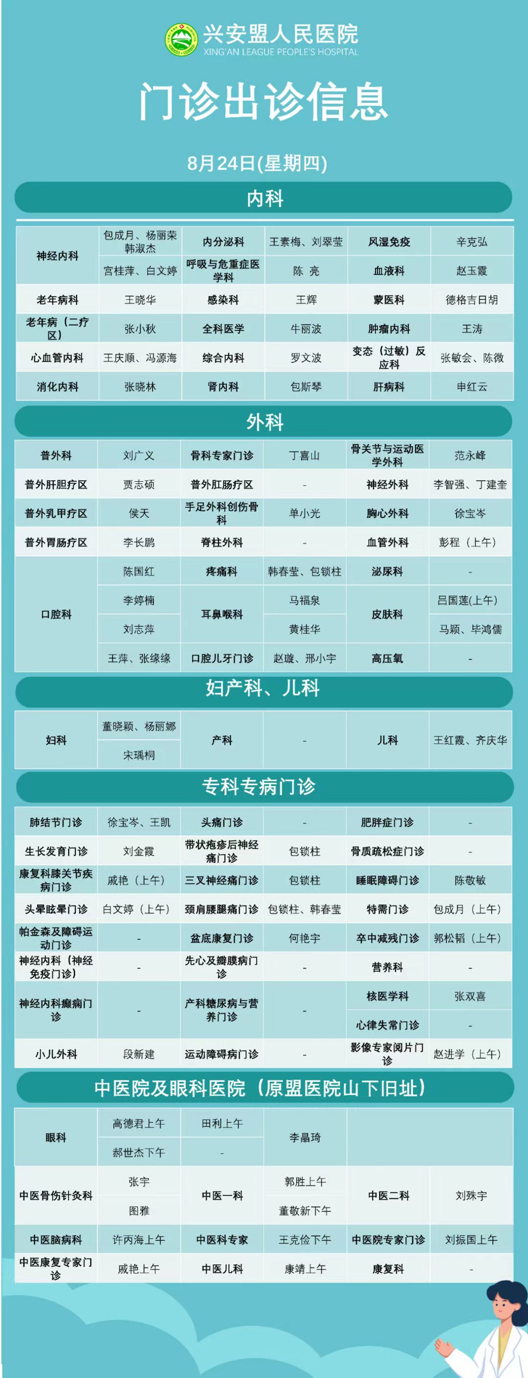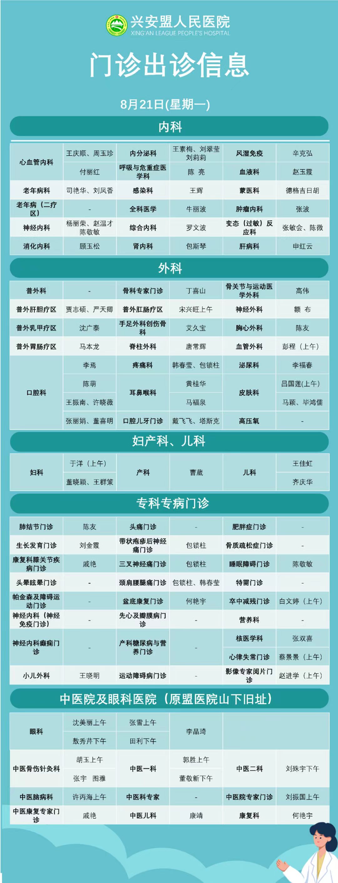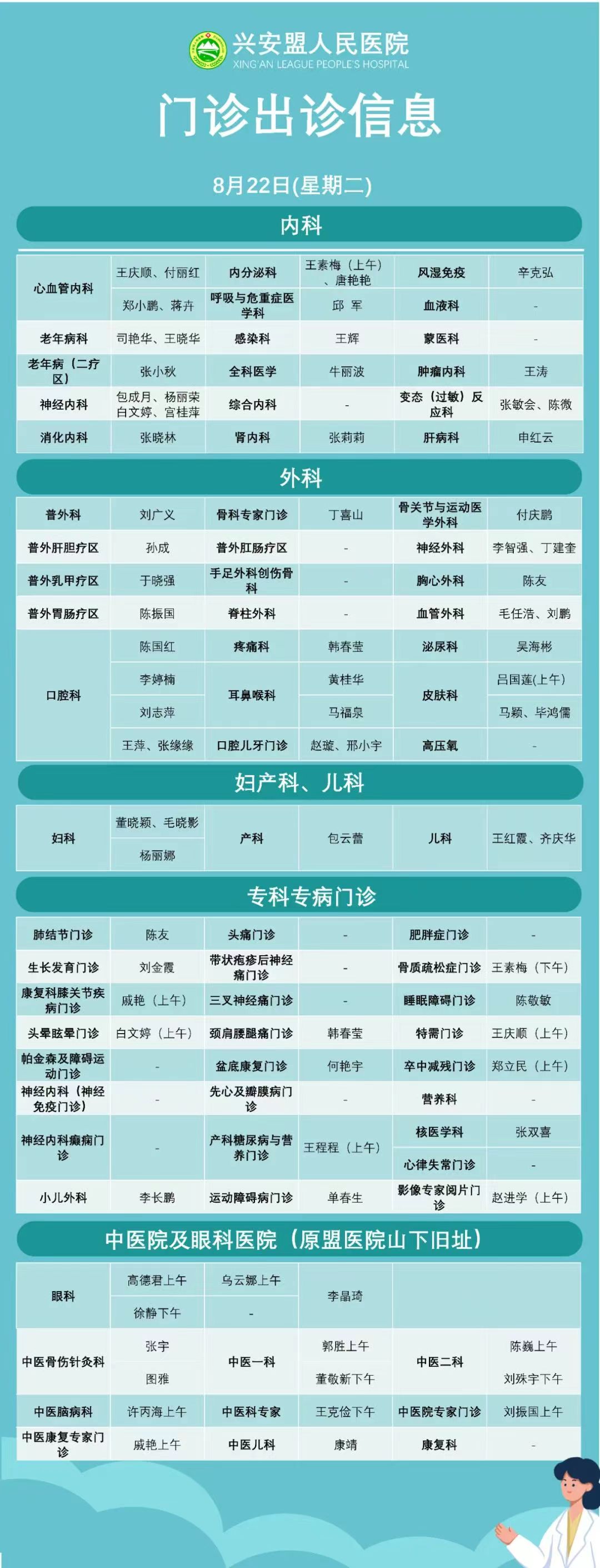 『出诊信息』盟人民医院8月21日-8月25日门诊出诊信息