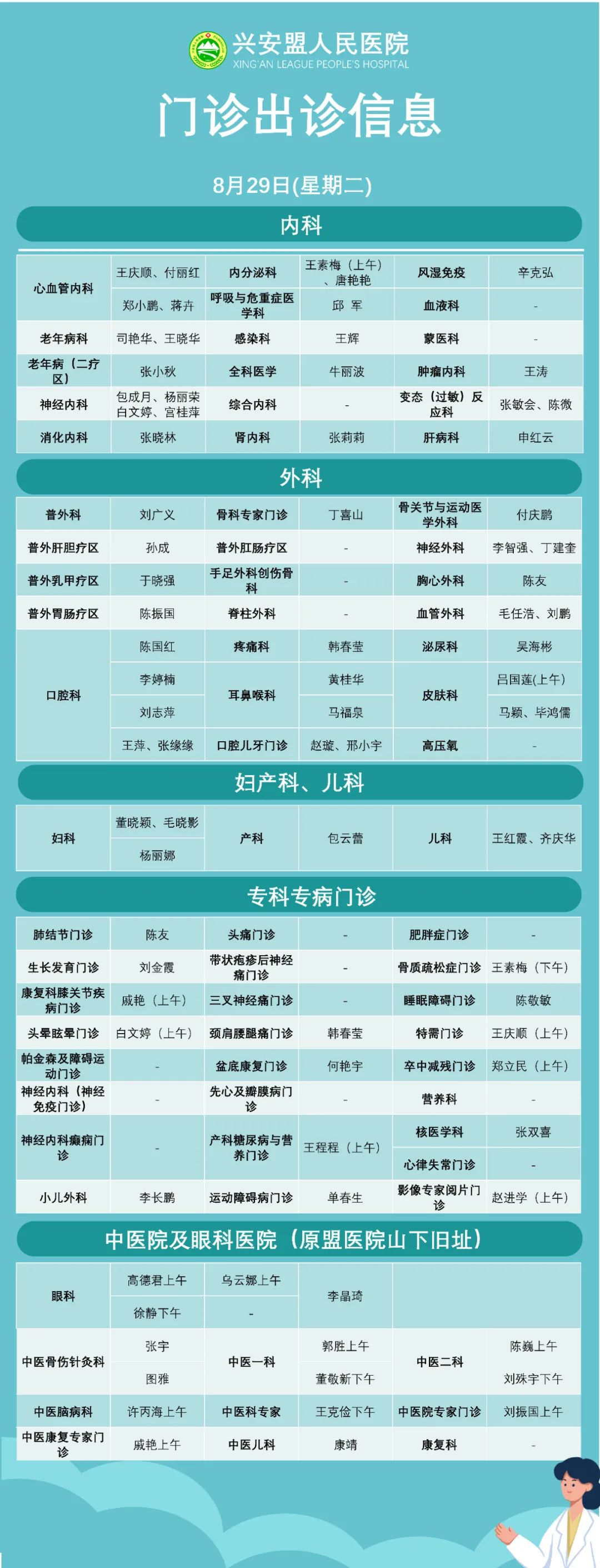 『出诊信息』盟人民医院8月28日-8月31日门诊出诊信息