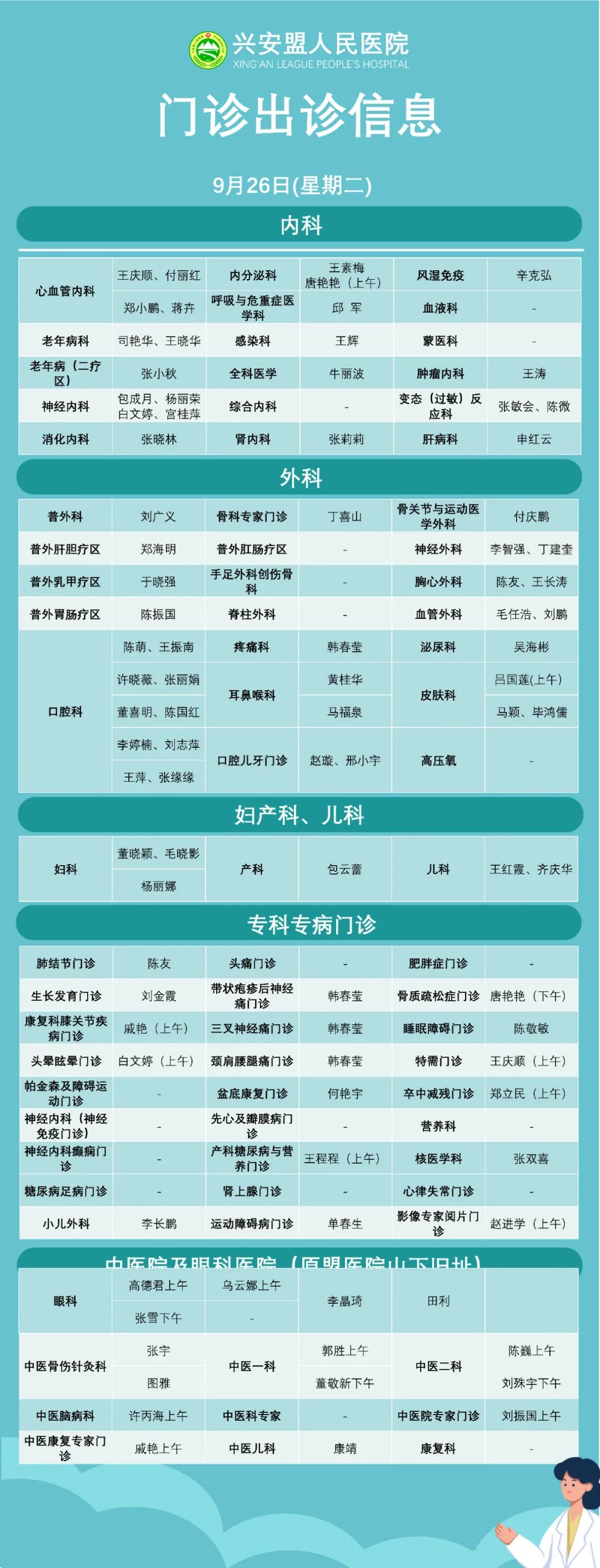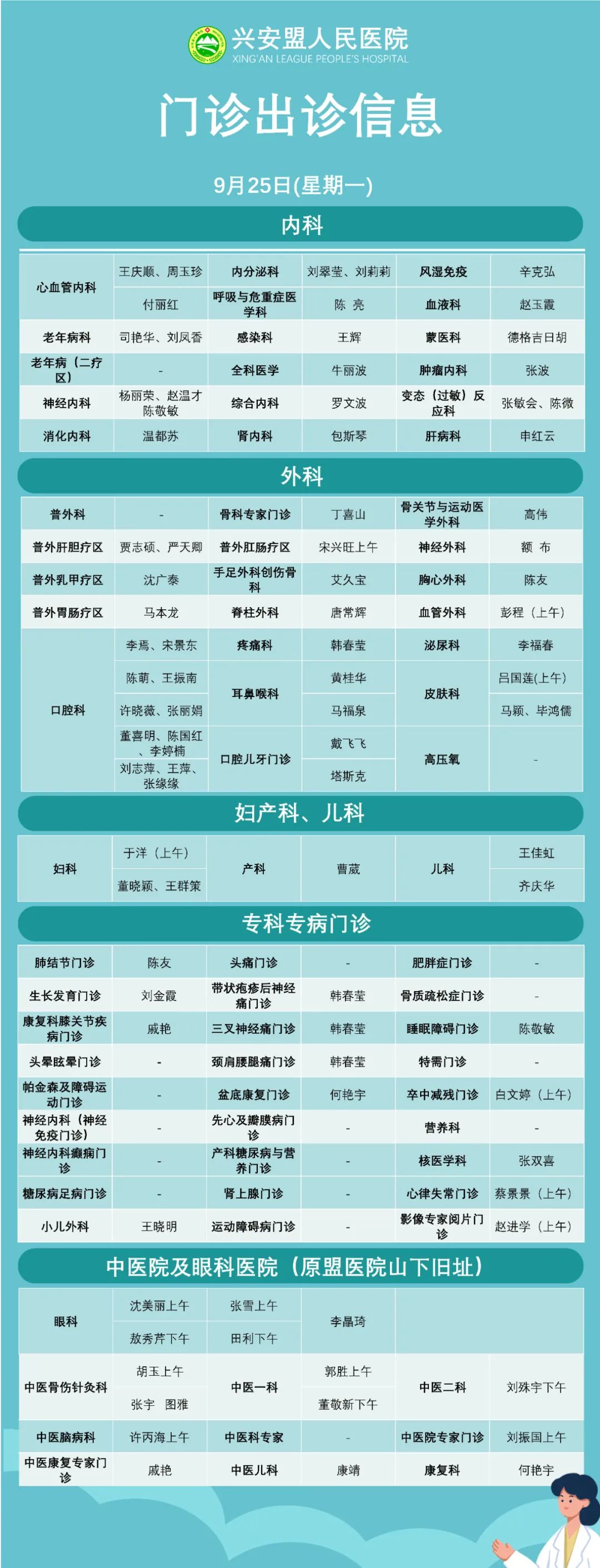 『出诊信息』盟人民医院9月25日-9月29日门诊出诊信息