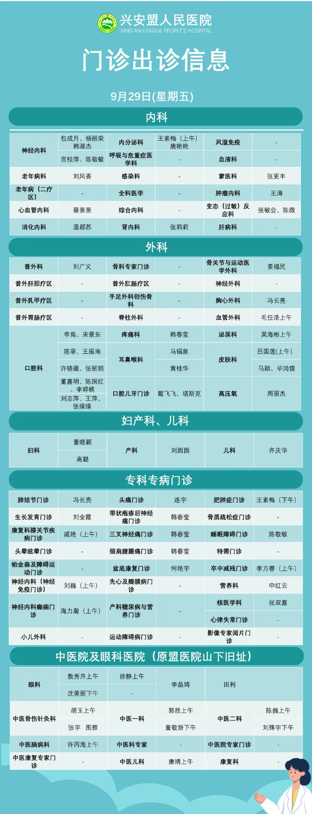 『出诊信息』盟人民医院9月29日-10月6日门诊出诊信息