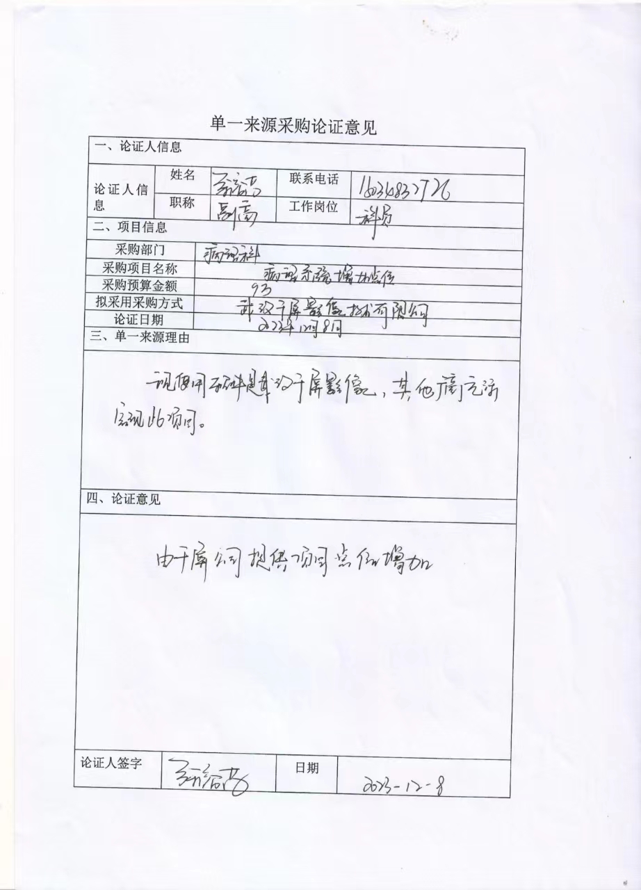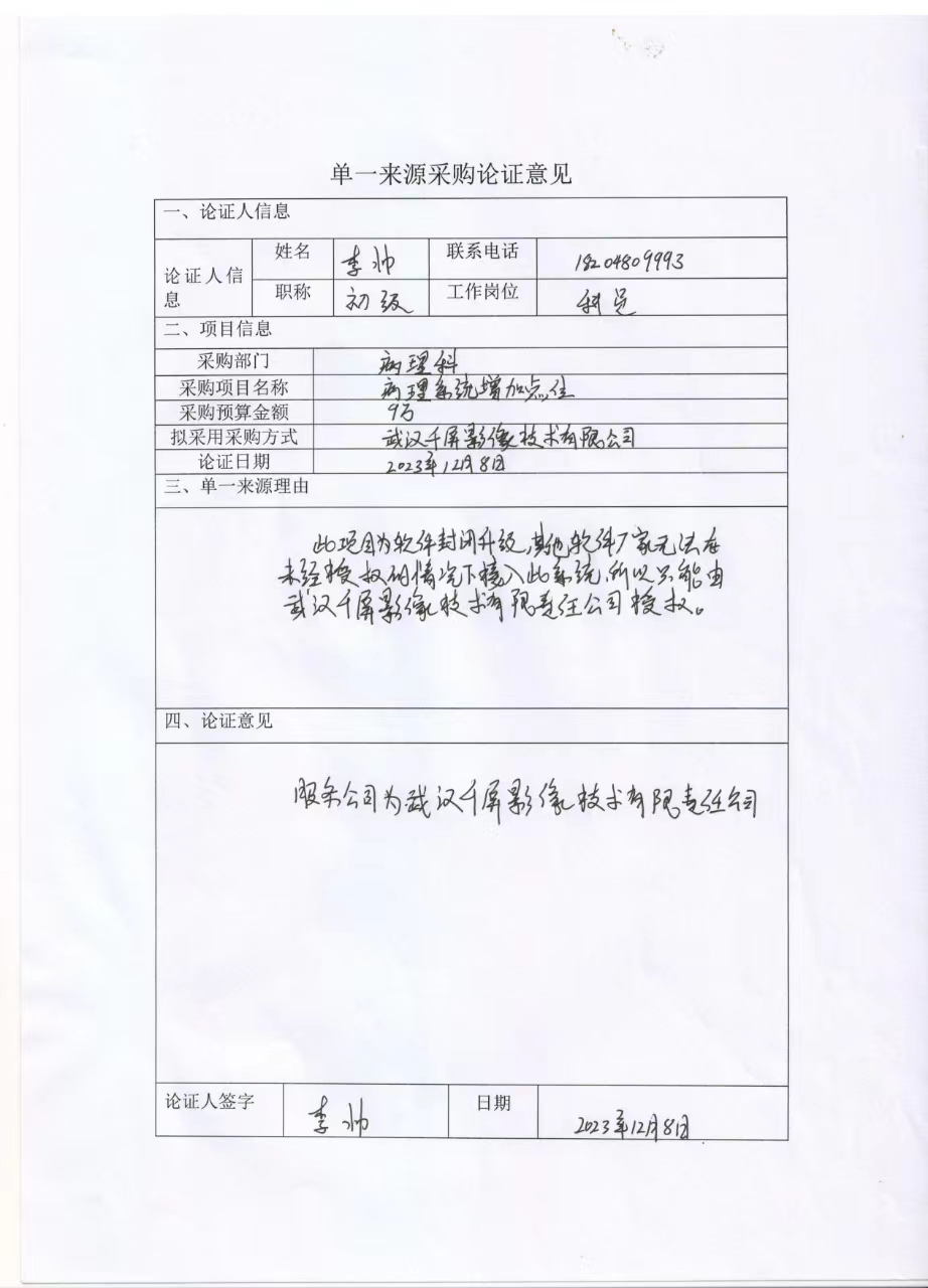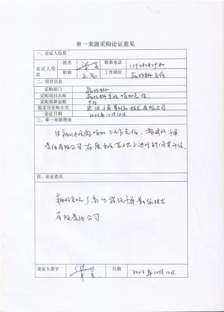 (三)采用单一来源采购方式的原因及相关说明:因病理科现使用系统是武汉千屏影像,其他厂商无法完成此项目。