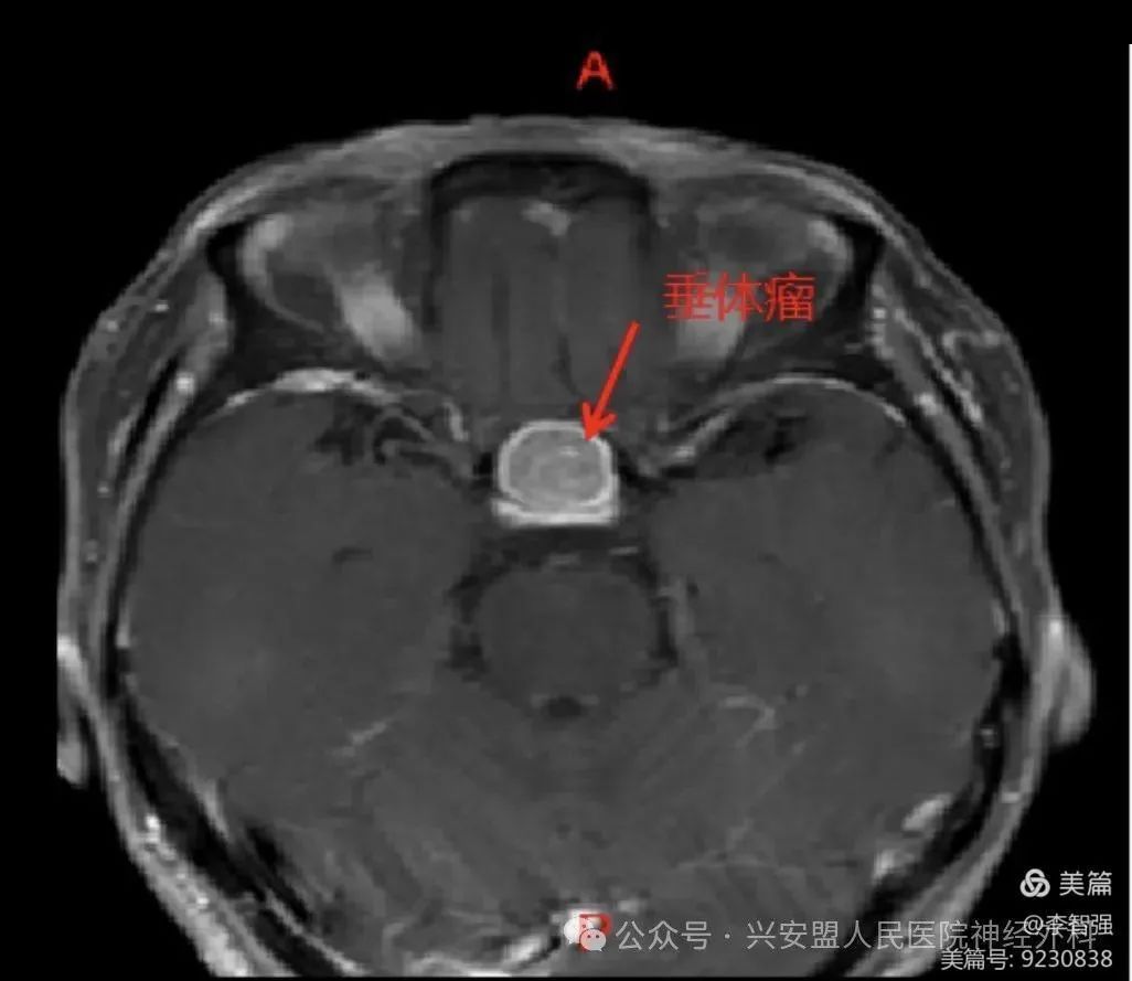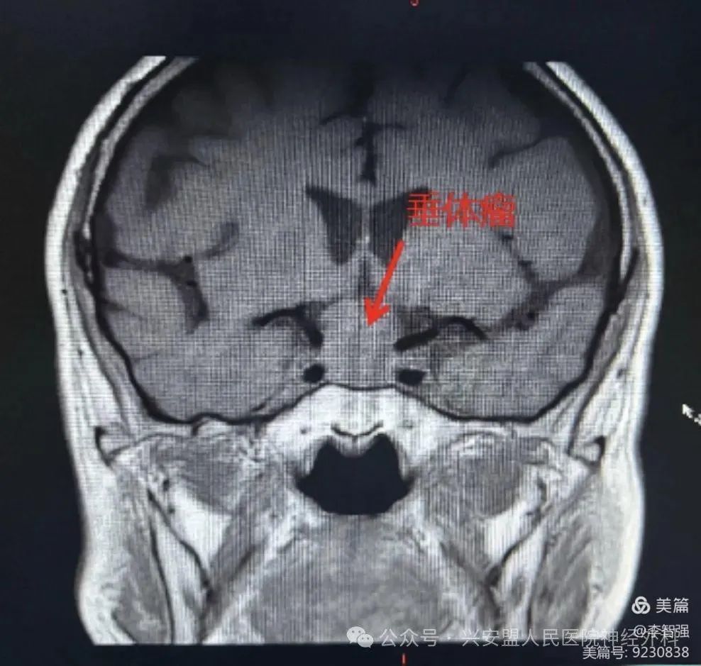 患者头颅核磁提示鞍区较大椭圆形病灶,视神经受压、上抬。