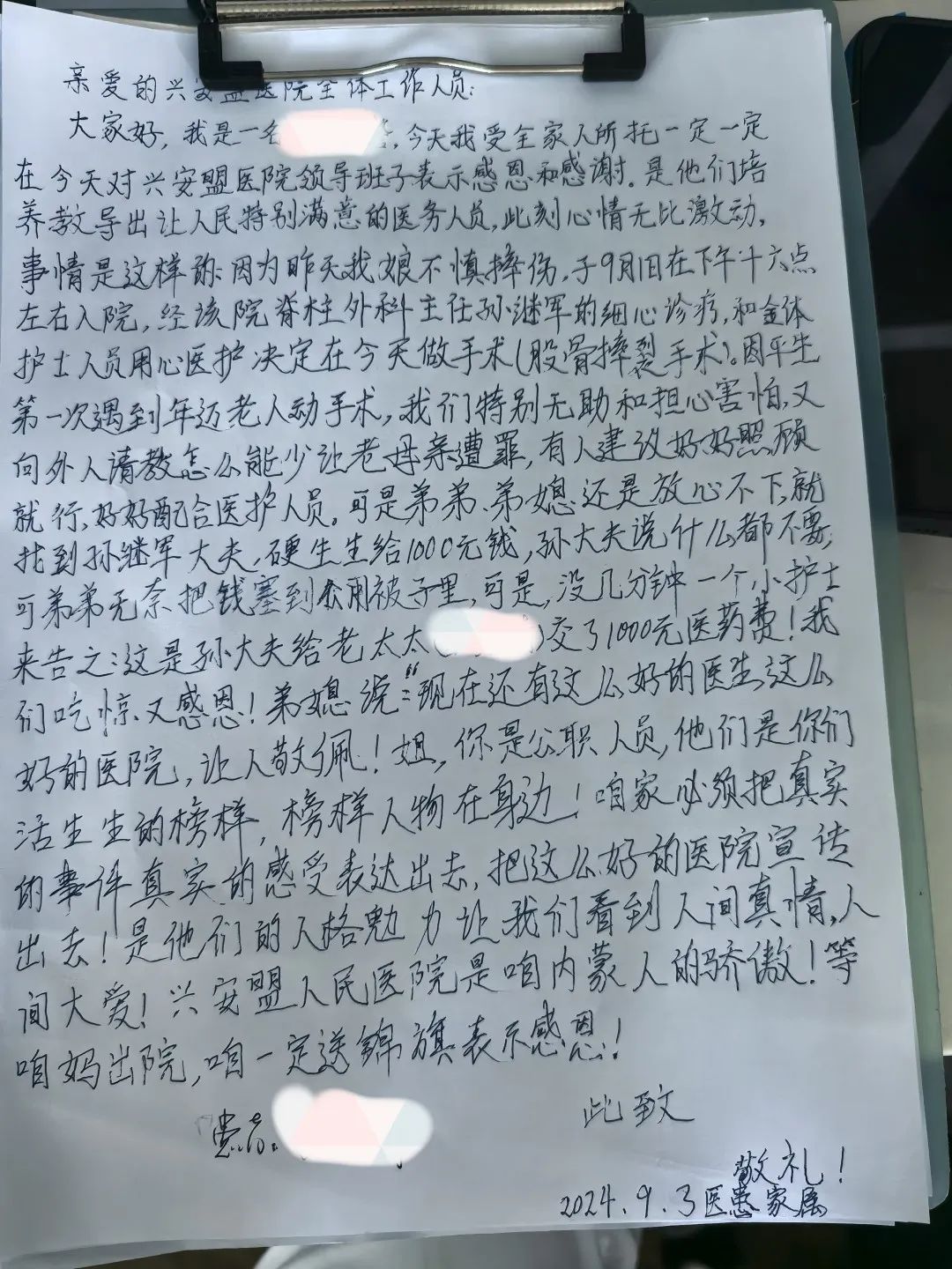 事情是这样的,因为昨天我娘不慎摔伤,于9月1日在下午16点左右入院,经该院脊柱外科孙医生的悉心诊疗和全体医护人员用心服务医护,决定在今天做手术(股骨摔裂手术)。因平生第一次遇到年迈老人动手术,我们特别无助和担心害怕,又向外人请教怎么办能少让老母亲遭罪,有人建议好好照顾就行,好好配合医务人员。可是弟弟、弟媳还是放心不下,就找到孙继军大夫,硬生生给1000元钱,孙大夫说什么都不要,可是弟弟无奈把钱塞到公用被子里,可是,没几分钟,一个小护士来告知:这是孙大夫给老太太交了1000元医药费!我们吃惊又感恩!弟媳说:“这么好的医生,这么好的医院让人敬佩!姐,你是公职人员啊,他们是你们活生生的榜样,榜样人物在身边!咱家必须把真实的事件真实的感受表达出去,把这么好的医院宣传出去!是他们的人格魅力让我们看到人间真情、人间大爱!兴安盟人民医院是咱内蒙人的骄傲!等咱妈出院,咱一定送锦旗表达感恩!”