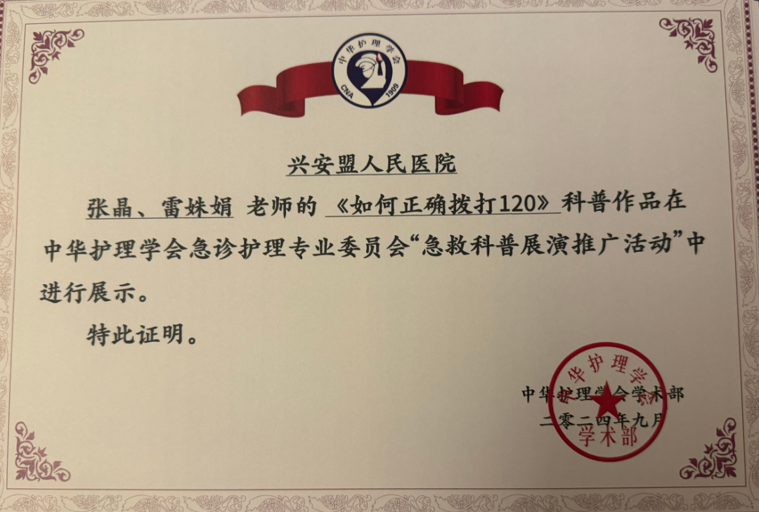 9月21日,中华护理学会主办的“急诊护理学术交流会议”急诊科普展演推广活动圆满落幕,兴安盟人民医院急诊护理团队凭借出色的表现,荣获了第三名的好成绩。