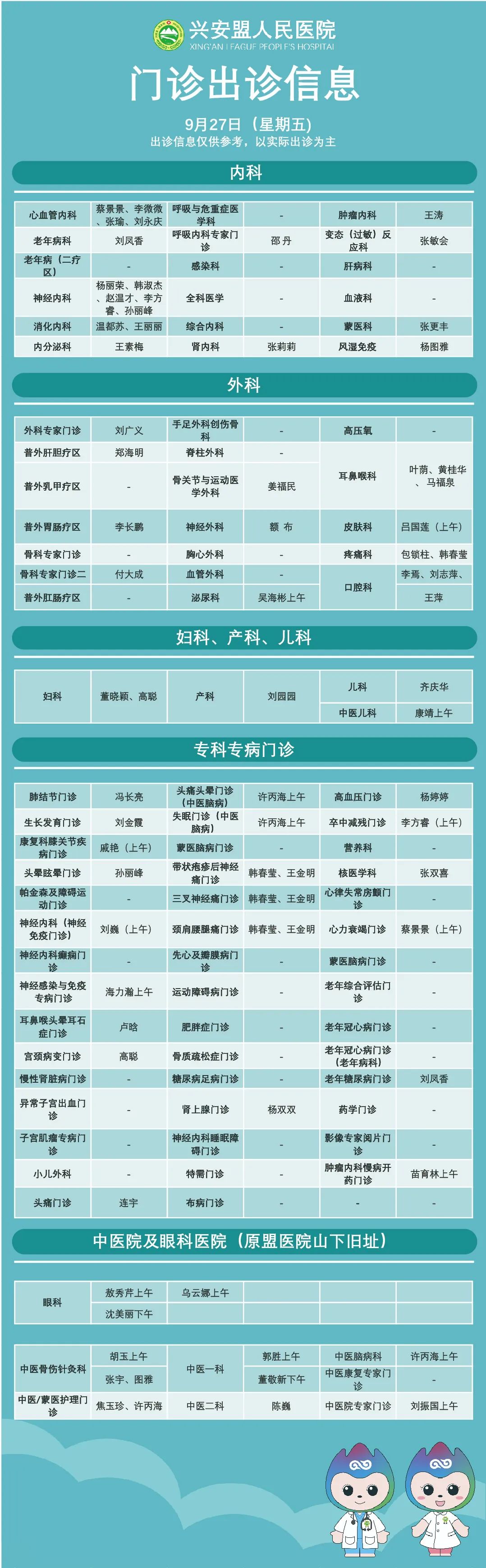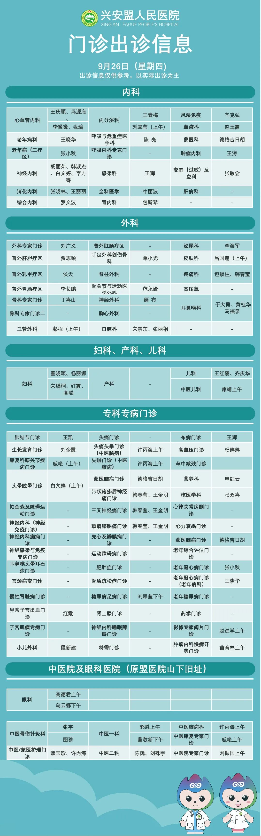 『出诊信息』兴安盟人民医院9月26日-27日出诊信息