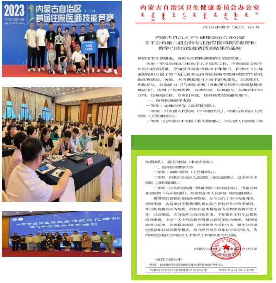 积极参加国家级自治区各类竞赛,在2022-2023年度内蒙古自治区住院医师规范化培训的竞赛中分别获得二等奖。