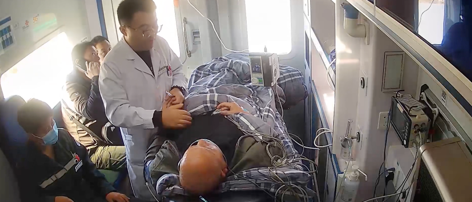 9时28分,医疗团队在车上实施溶栓治疗。整个过程紧凑有序,每个环节精准无误。