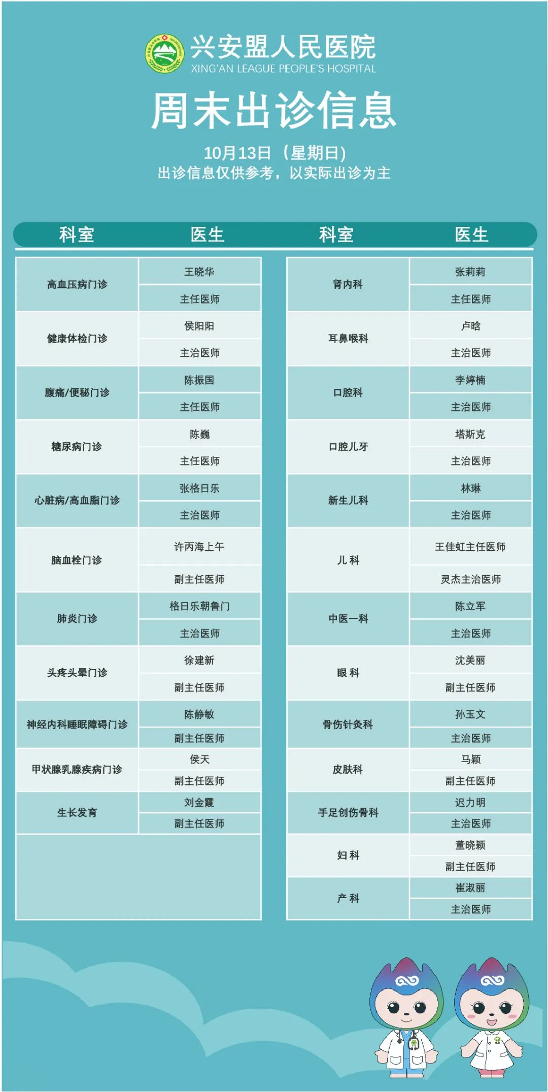 『出诊信息』兴安盟人民医院10月13日(星期日)出诊信息