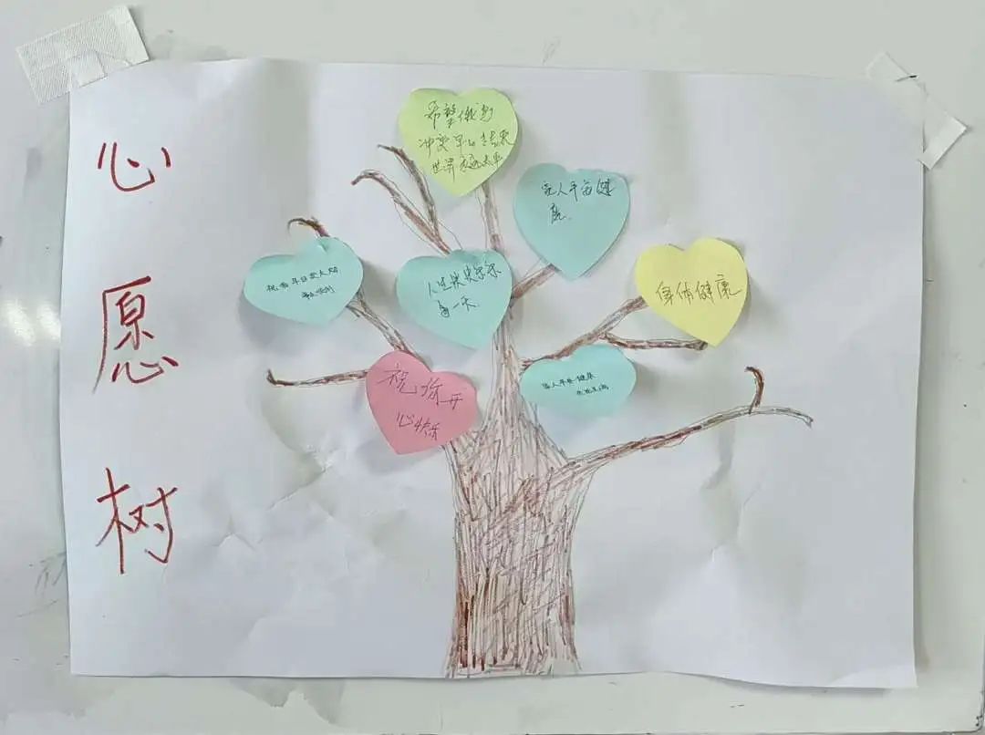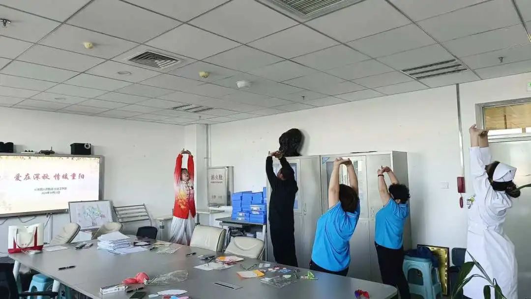 首先,医务社工为老人们讲解了重阳节的由来和习俗,让老人们深刻感受到了这一传统节日的文化内涵和历史底蕴。随后,医务社工通过“折手指”等趣味小游戏引导老人们开启了一场叙事之旅,大家回忆起年轻时的奋斗记忆,分享着自己的人生故事,每一个故事都如同一颗璀璨的明珠,承载着老人们的记忆与情感;在回忆往昔过后,社工带领大家制作心愿树,一起展望美好的未来。活动中,医务社工还链接资源,中医二科的护师刘岩为老人们带来“八段锦”教学,体会中医养生的魅力。小组活动的最后环节,老人们围坐在一起,在医务社工的指导下,认真地制作着精美的不织布手捧花,大家互相欣赏、互相交流,欢声笑语回荡在活动室内。