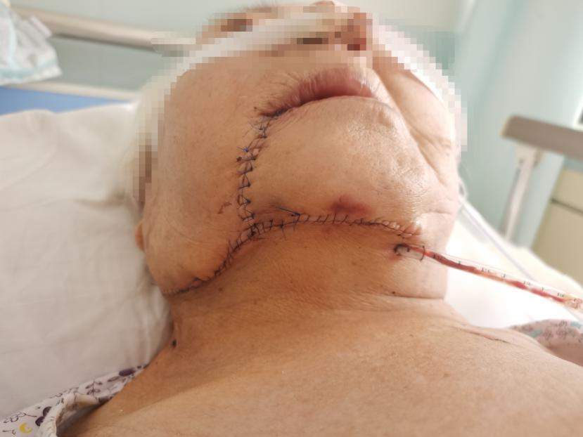 考虑患者94岁高龄并且手术创伤较大,与家属充分沟通后,决定外请北京大学口腔医院张杰教授为其主刀手术,术前完善相关科室会诊及麻醉评估,确认无手术禁忌症后,在我院口腔科团队的密切配合下,为患者实施了“右侧上颌牙龈鳞状细胞癌扩大切除术+右侧颊部鳞状细胞癌扩大切除术+右侧上颌骨部分切除术+右侧下颌骨喙突切除术+右侧颈部淋巴结清扫术+颏部带蒂皮瓣制取移植术”。