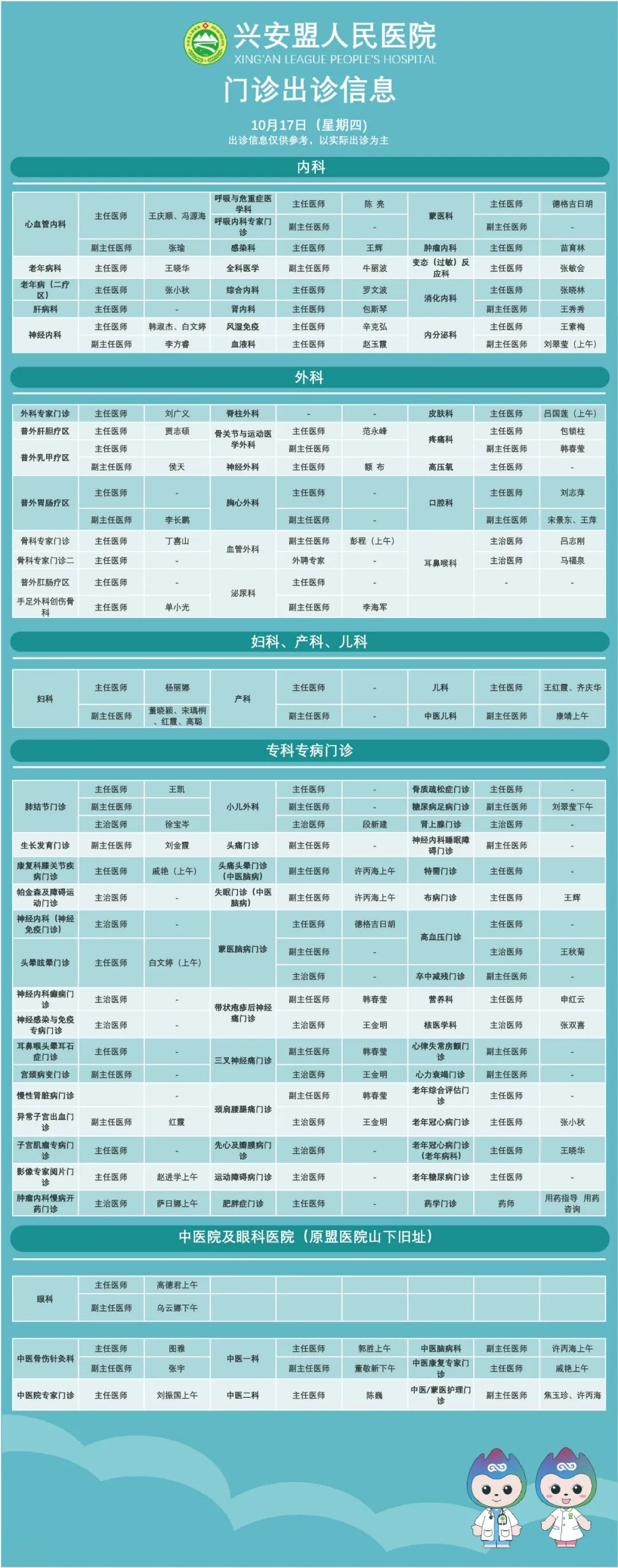 『出诊信息』兴安盟人民医院10月17日-18日出诊信息