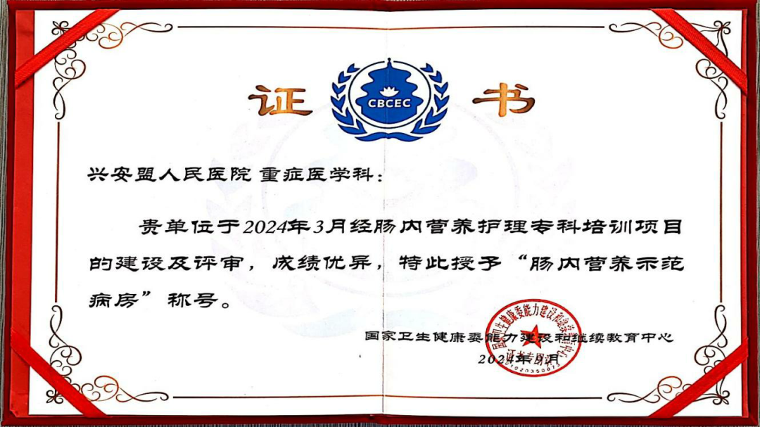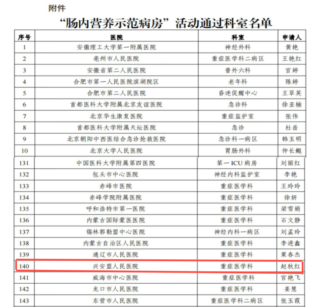 9月2日,国家卫生健康委能力建设和继续教育中心公布“肠内营养示范病房”活动通过科室名单,该项目有全国26个省506家医疗机构进行申报,287家进入现场评审阶段,经过层层筛查全国共有232家医疗机构,其中内蒙古自治区有9家医院通过评审,兴安盟人民医院重症医学科以优异的成绩获批国家级“肠内营养示范病房”称号。