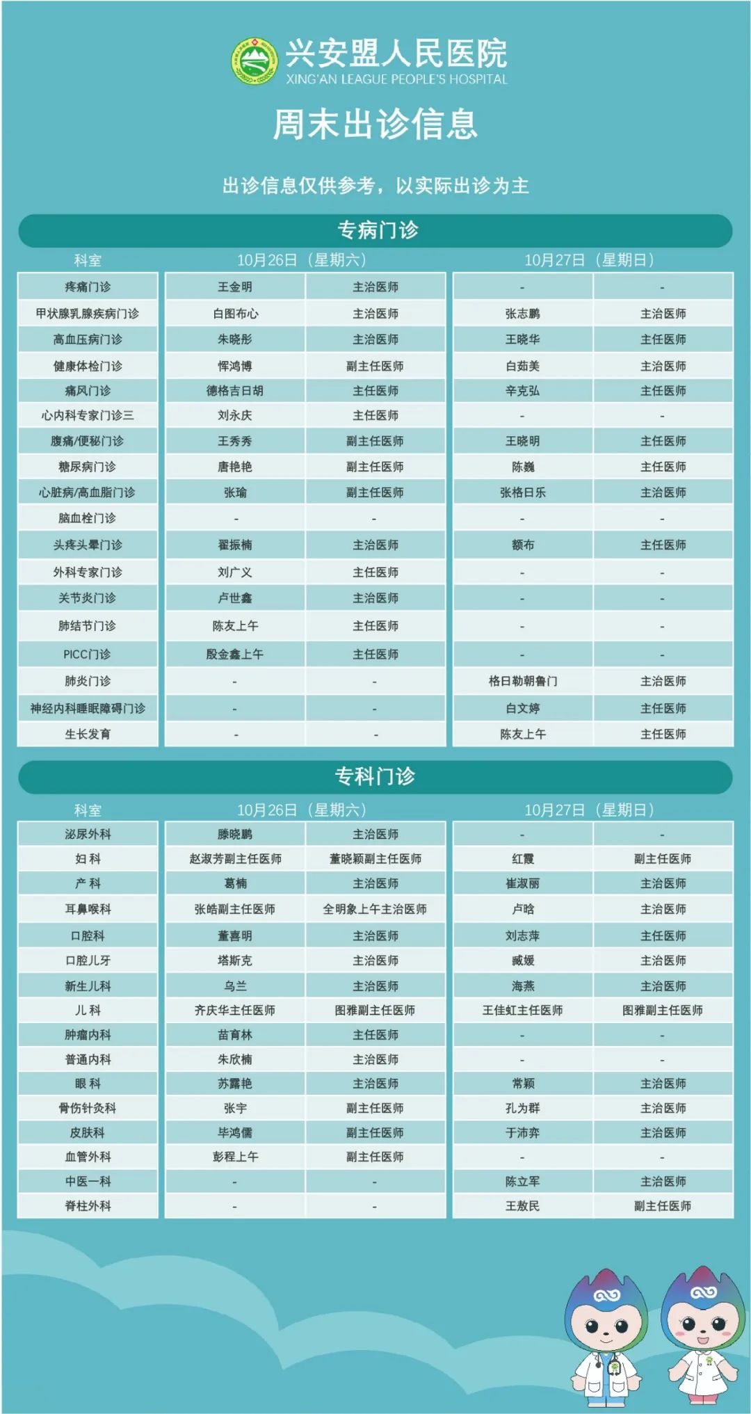 『出诊信息』兴安盟人民医院10月31日-11月1日出诊信息