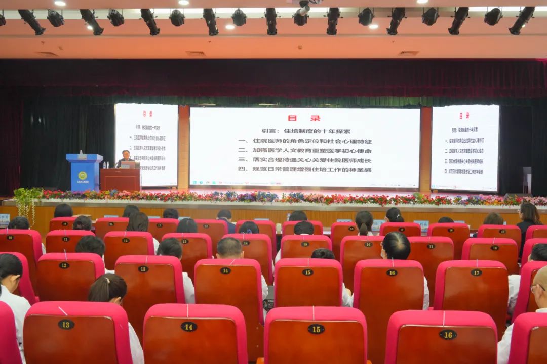 王金合巡视员的讲座以《加强人文教育筑牢初心使命,培养人格健全德能双馨的医者》为主题,内容涵盖了住培制度的十年探索、住院医师的角色定位与社会心理特征、加强医学人文教育重塑医学初心使命、落实合理待遇关心关爱住院医师成长、规范日常管理增强住培工作的神圣感等多个方面。他首先带领大家回顾了住院医师规范化培训工作十年的发展历程,从最初的摸索尝试到如今的体系完善,每一步都凝聚着无数医务工作者的智慧与汗水。他深入剖析了住院医师在医学学习、临床实践、患者沟通等方面的角色定位与社会心理特征,指出他们既是医学知识的探索者,也是患者健康的守护者,承载着社会与家庭的双重期望,因此需要更加注重其心理建设与人文关怀。