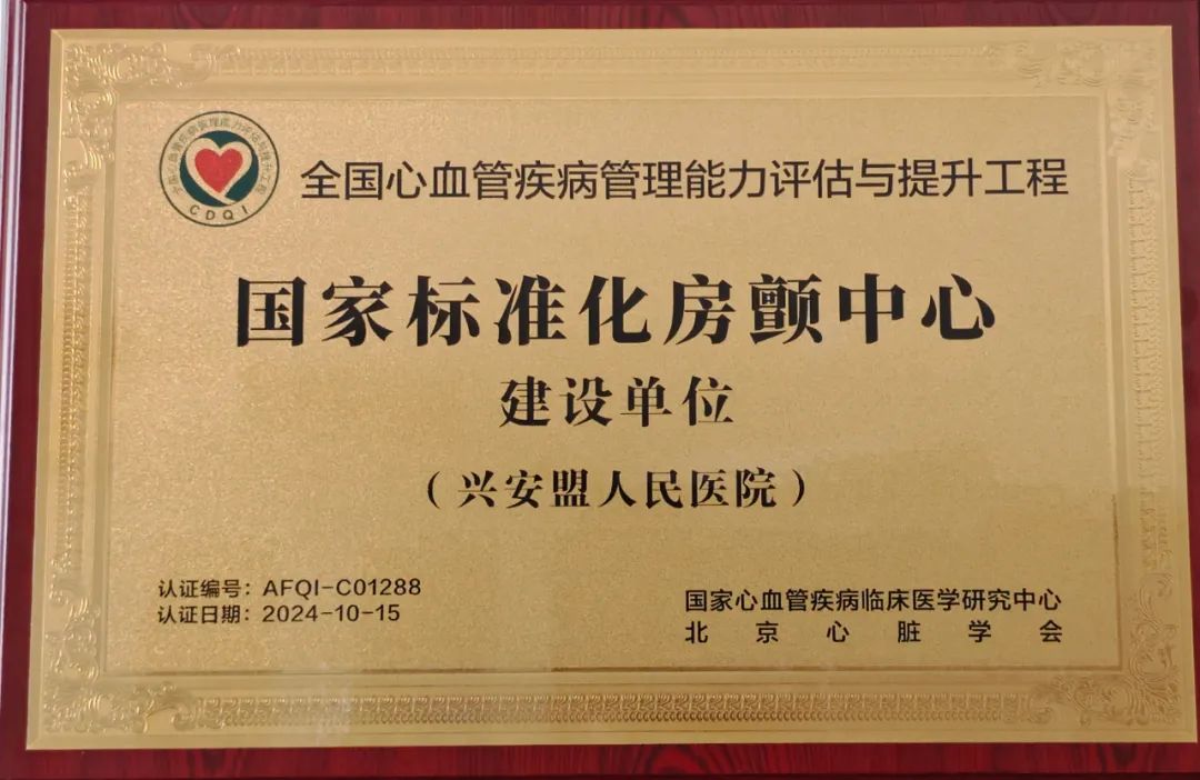 10月25日-26日,全国心血管疾病管理能力评估与提升工程(CDQI)《CDQI国家标准化房颤中心建设-内蒙古自治区区域启动会以及京蒙合作—推动内蒙古公立医院高质量发展项目》工作会议在内蒙古呼和浩特召开的。兴安盟人民医院被授予“国家标准化房颤中心建设单位”。