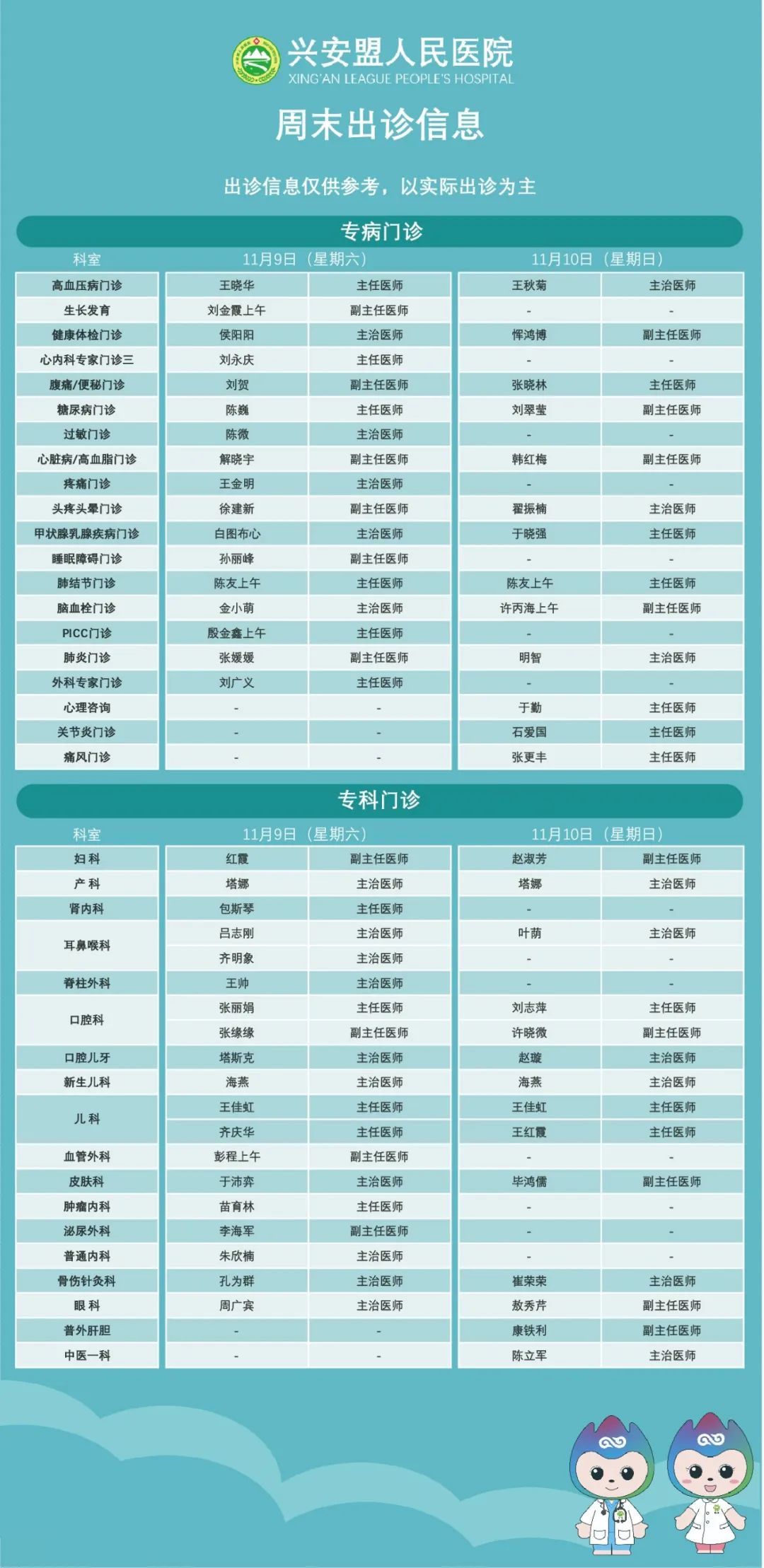 『出诊信息』兴安盟人民医院11月7日-11月8日出诊信息