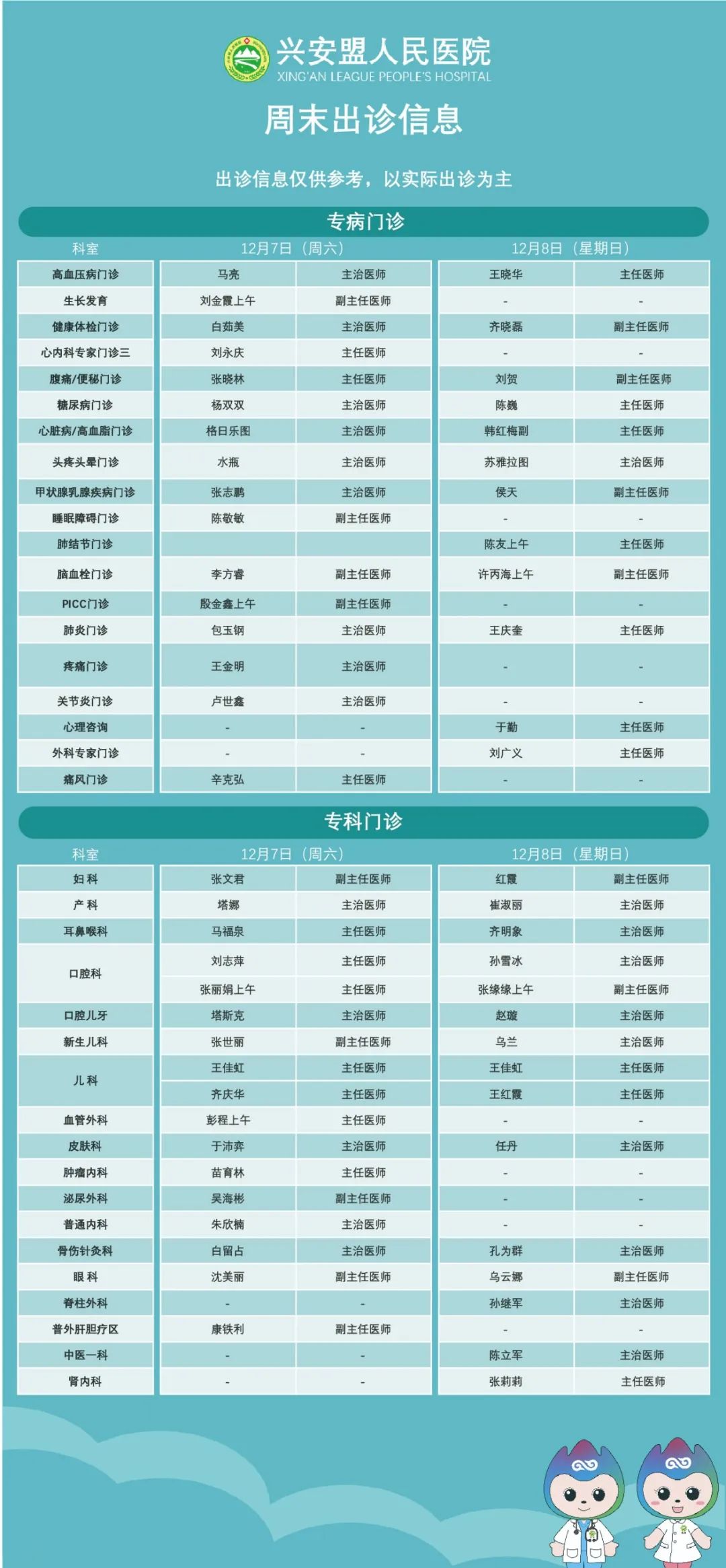 『出诊信息』兴安盟人民医院12月9日-11日出诊信息
