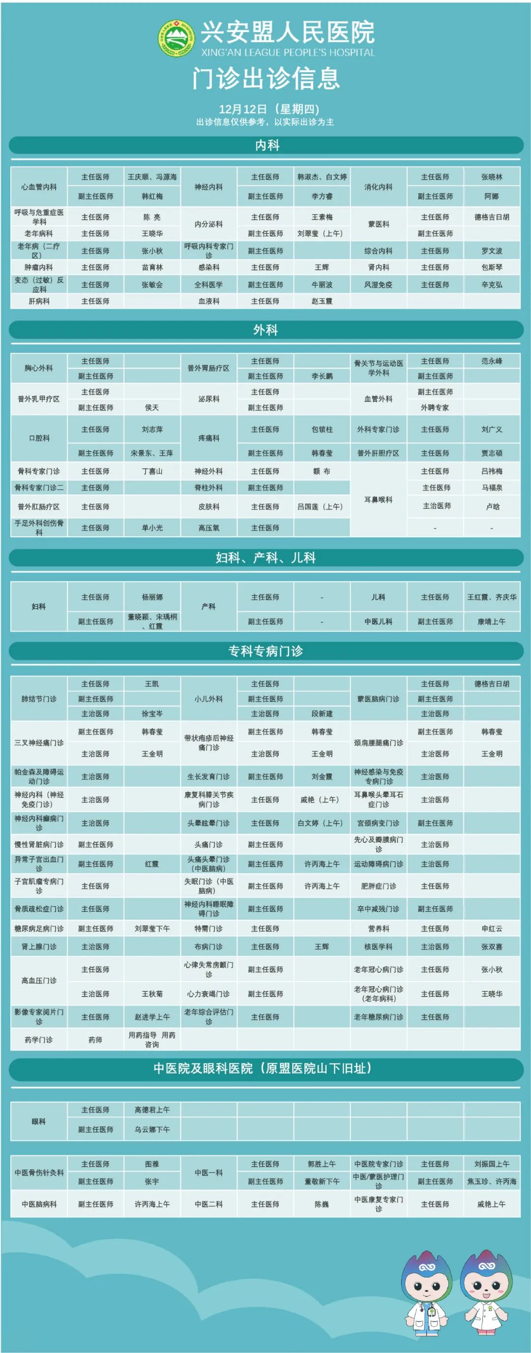 『出诊信息』兴安盟人民医院12月12日-13日出诊信息