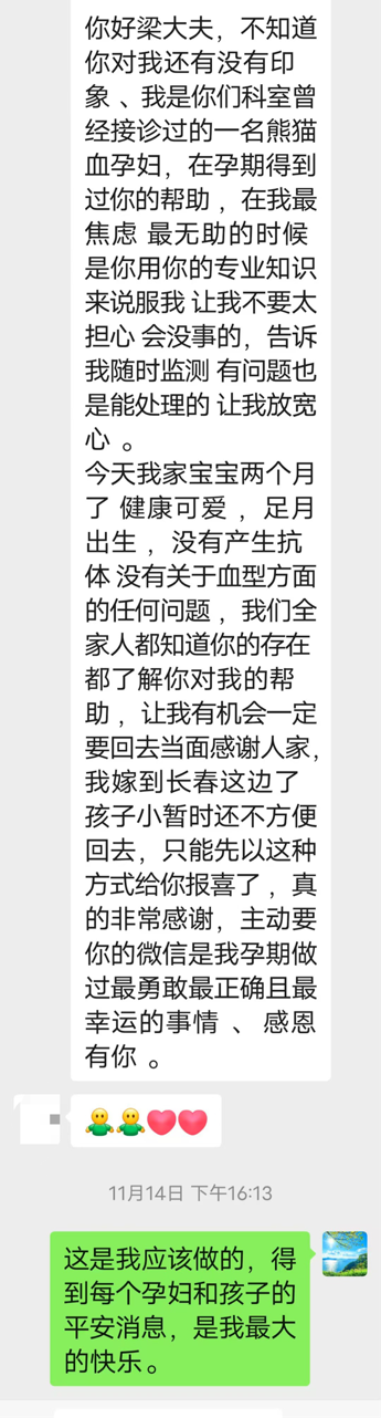 “你好梁大夫,不知道你对我还有没有印象,我是你们科室曾经接诊过的一名熊猫血孕妇,在孕期得到过你的帮助,在我最焦虑、最无助的时候,是你用你的专业知识来说服我,让我不要太担心,会没事的。告诉我随时监测,有问题也是能处理的,让我放宽心……”