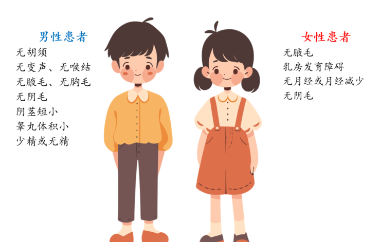 对于男性患者而言,青春期可能迟迟不来。他们的嗓音依然尖细,没有出现变声现象;胡须、腋毛、阴毛等第二性征生长极为缓慢甚至不生长;外生殖器也停留在幼稚状态,阴茎短小,睾丸发育不良,无法产生足够的精子,导致成年后生育能力受到极大威胁。他们在心理上也会因为自己与同龄人在身体发育上的差异而产生自卑、焦虑等情绪,在青春的舞台上只能默默地躲在角落,看着别人尽情展现活力与魅力,自己的青春仿佛被按下了“暂停键”。