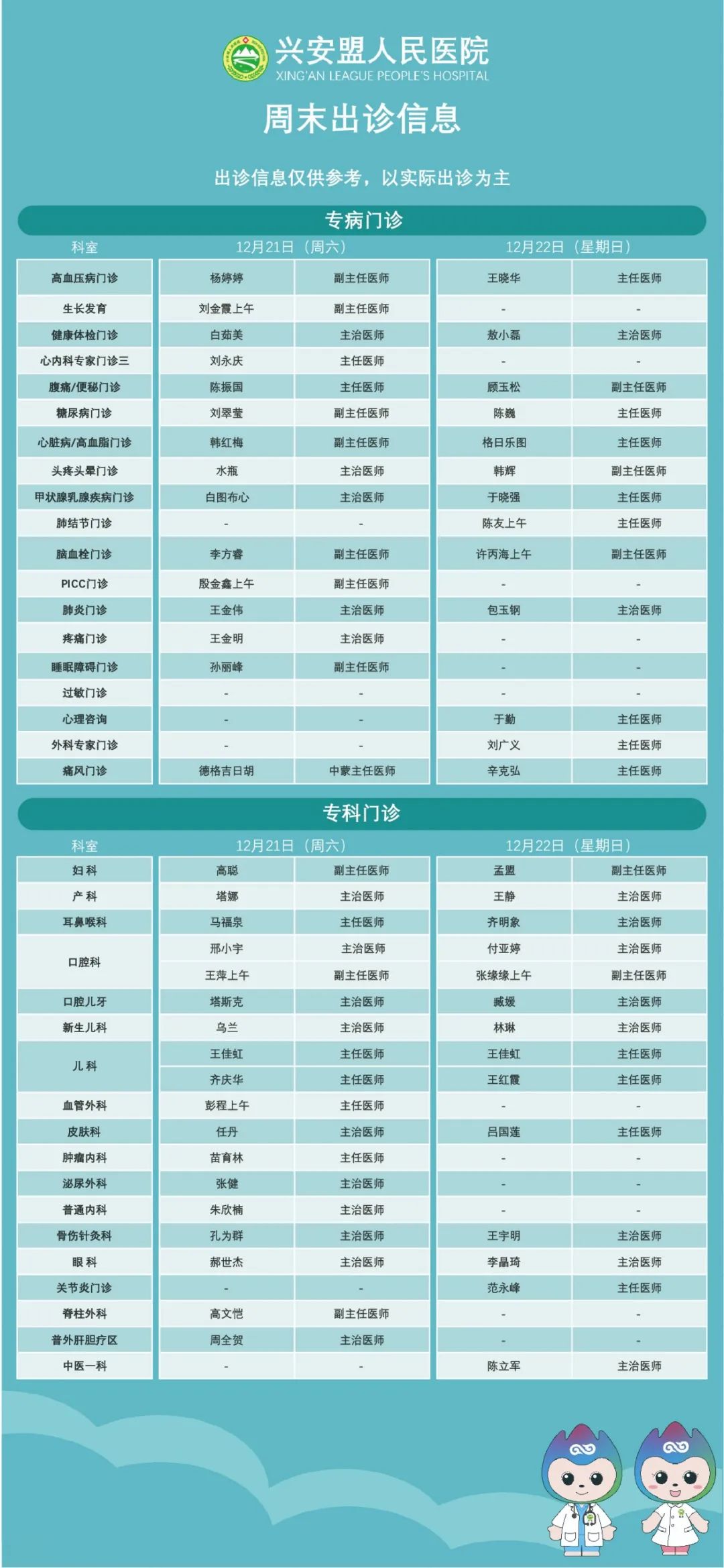 『出诊信息』兴安盟人民医院12月19日-20日出诊信息