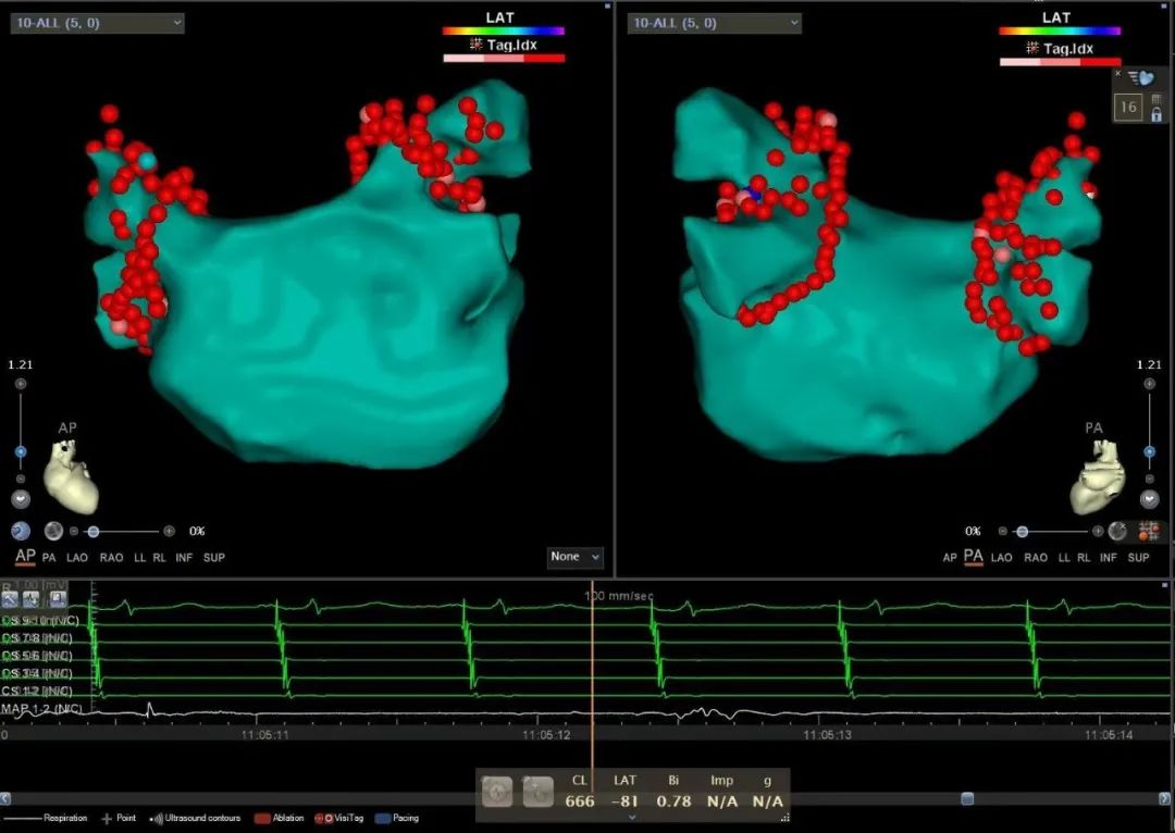 手术过程中,一个意外的发现更凸显了此次治疗的重要性——武先生除房颤外,还并发有室上性心动过速,具体为右后间隔旁道参与的异常心电传导路径(形象比喻为心脏中多出的“一条道”)。面对这一复杂情况,专家团队凭借精准的电生理检查与定位技术,成功“铲除”了这一病灶,从根本上解除了武先生多年来的病痛折磨。