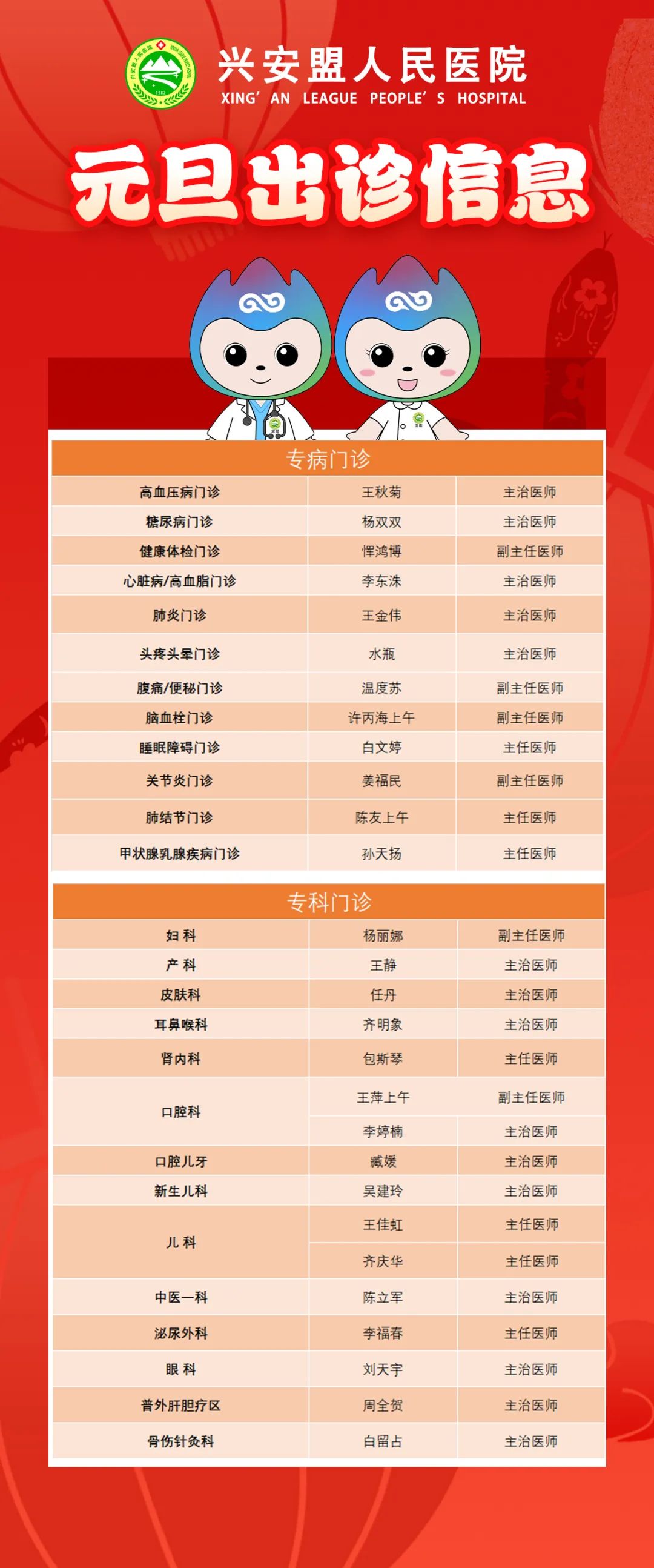 『出诊信息』兴安盟人民医院元旦假期出诊信息