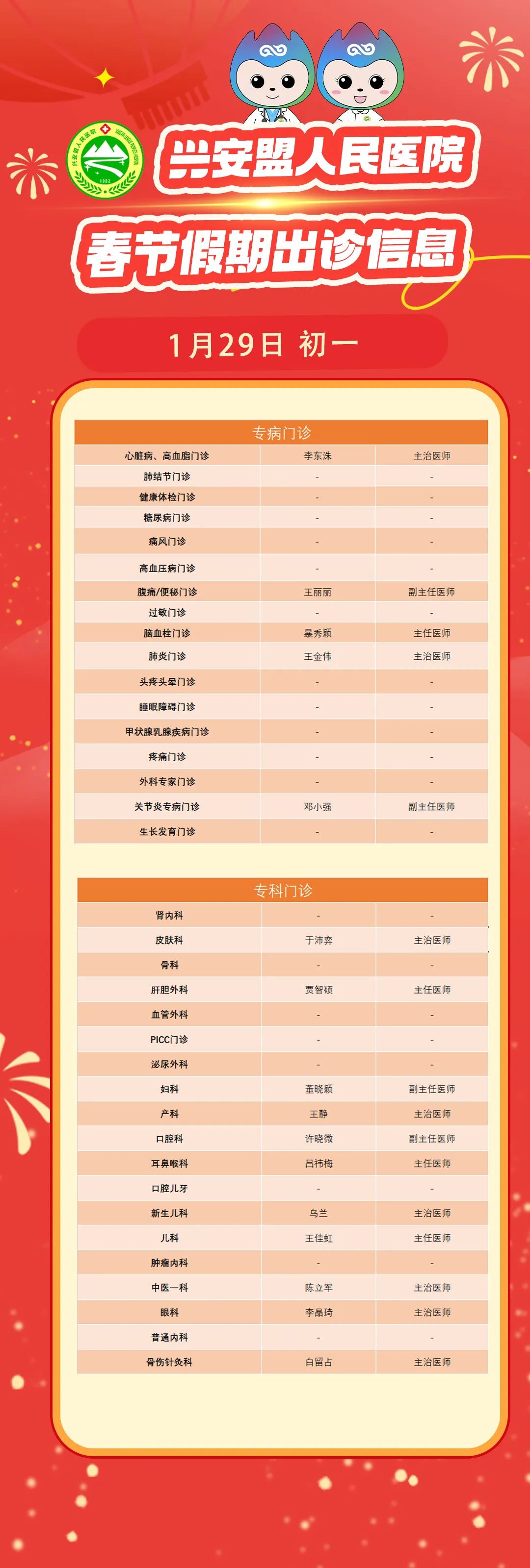 『出诊信息』兴安盟人民医院1月29日(初一)出诊信息