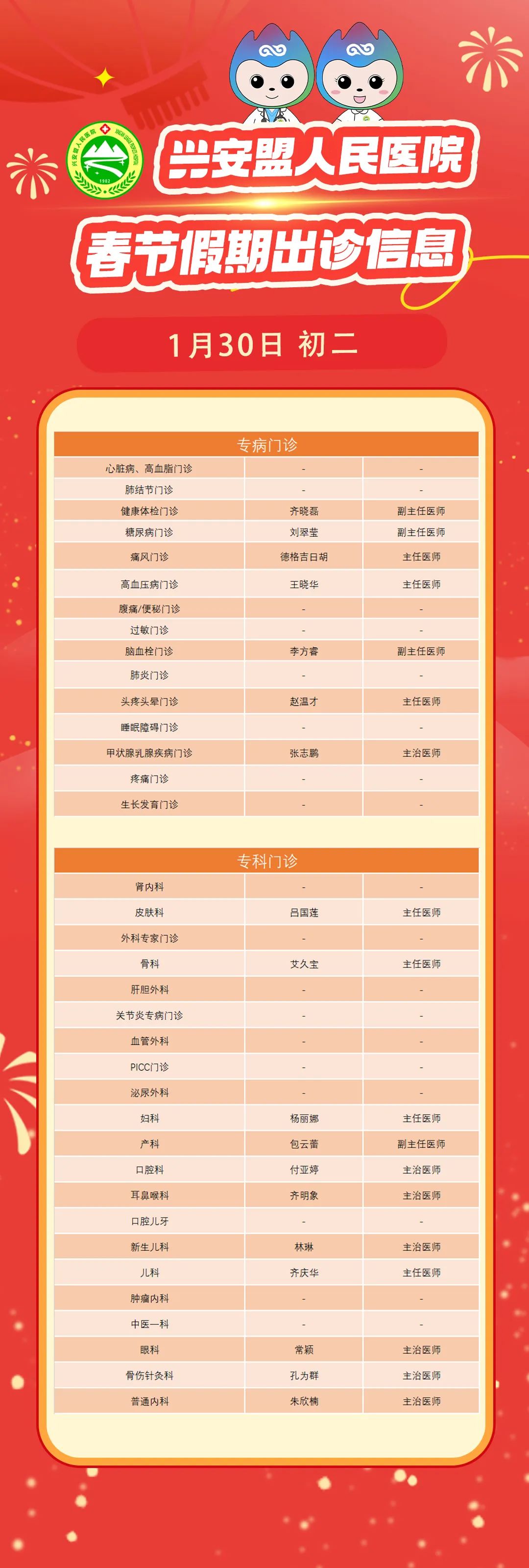 『出诊信息』兴安盟人民医院1月30日(初二)出诊信息