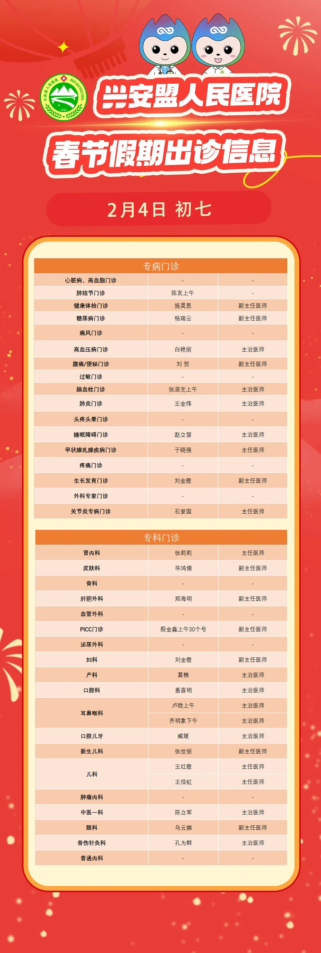 『出诊信息』兴安盟人民医院2月4日(初七)出诊信息