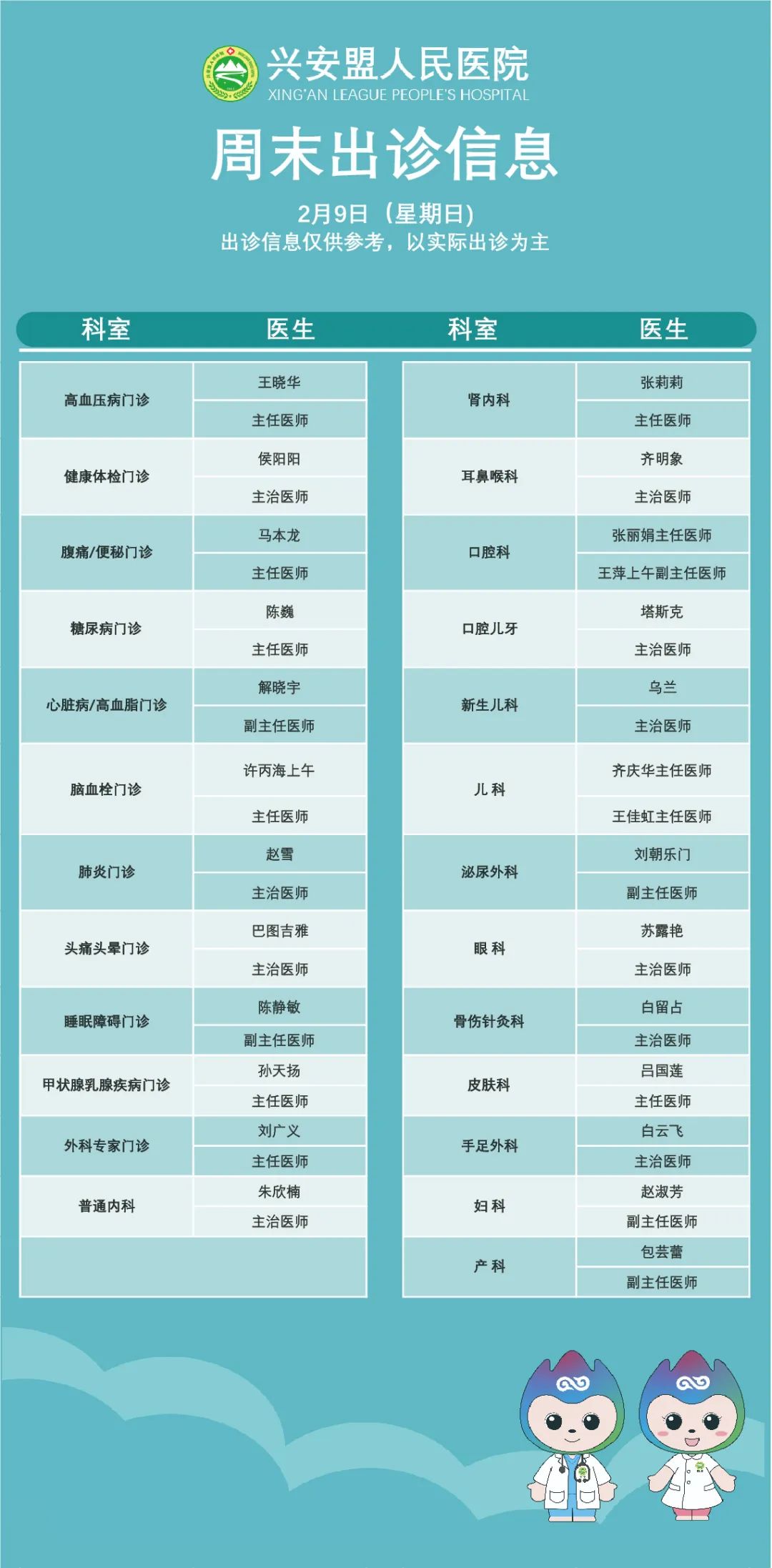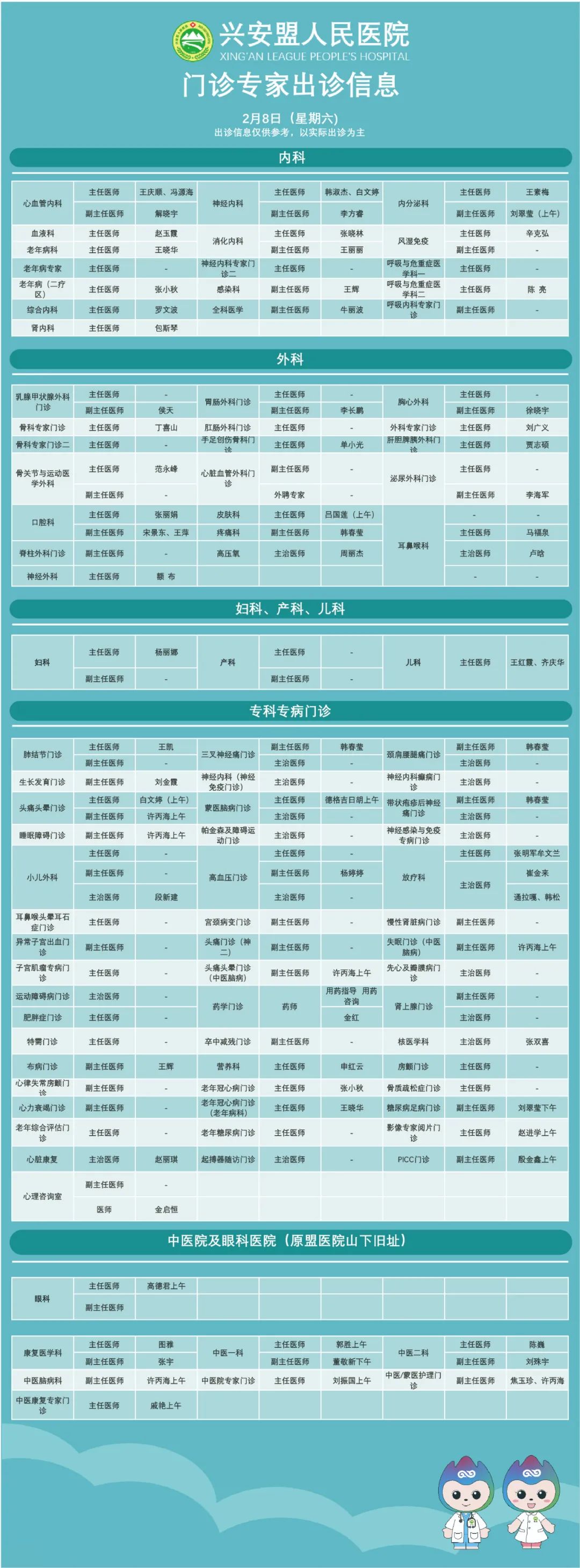 『出诊信息』兴安盟人民医院2月8日-9日出诊信息