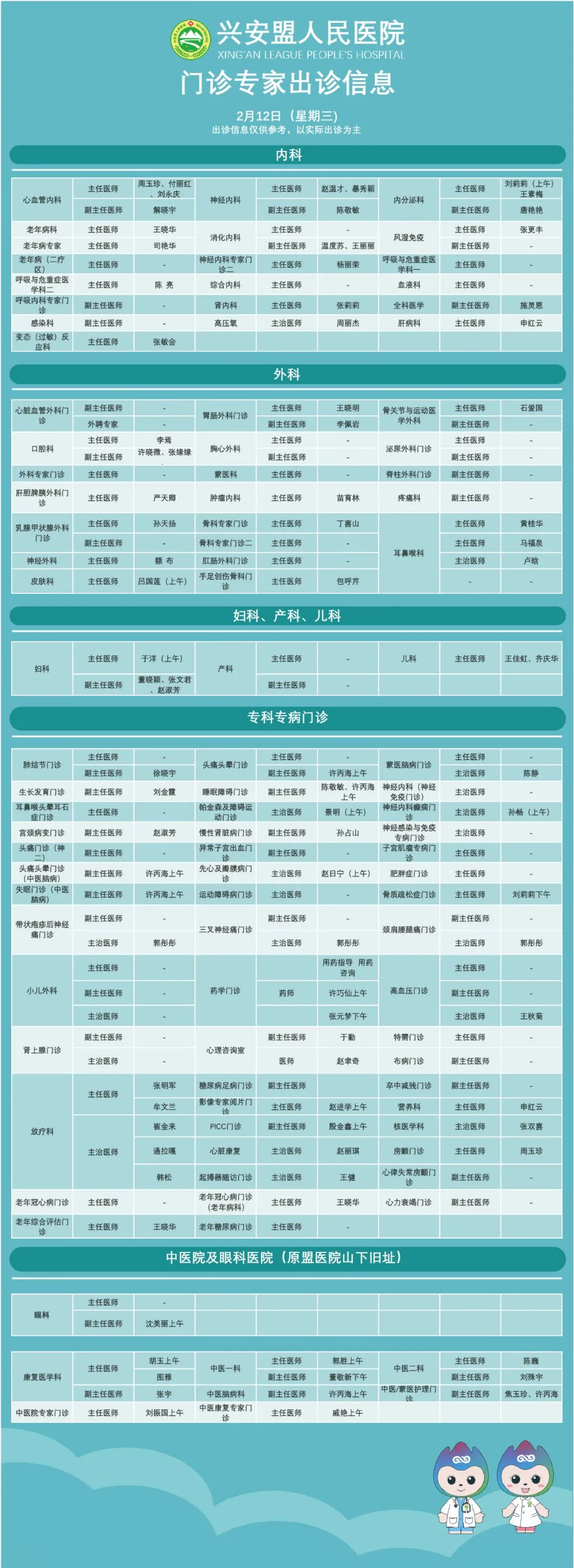 『出诊信息』兴安盟人民医院2月10日-12日出诊信息