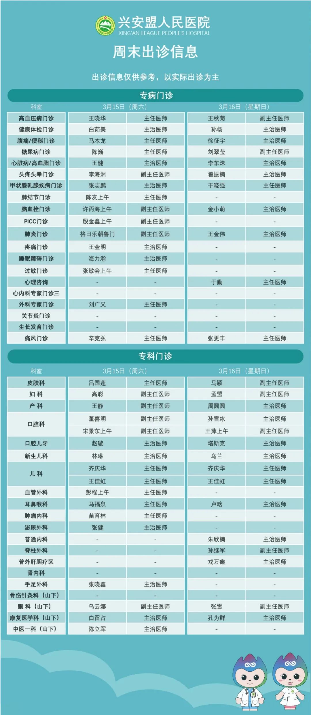 『出诊信息』兴安盟人民医院3月13日-14日出诊信息