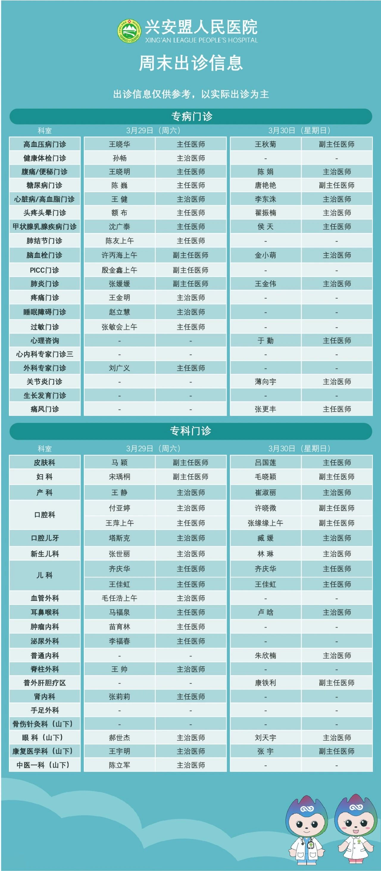『出诊信息』兴安盟人民医院3月27日-28日出诊信息