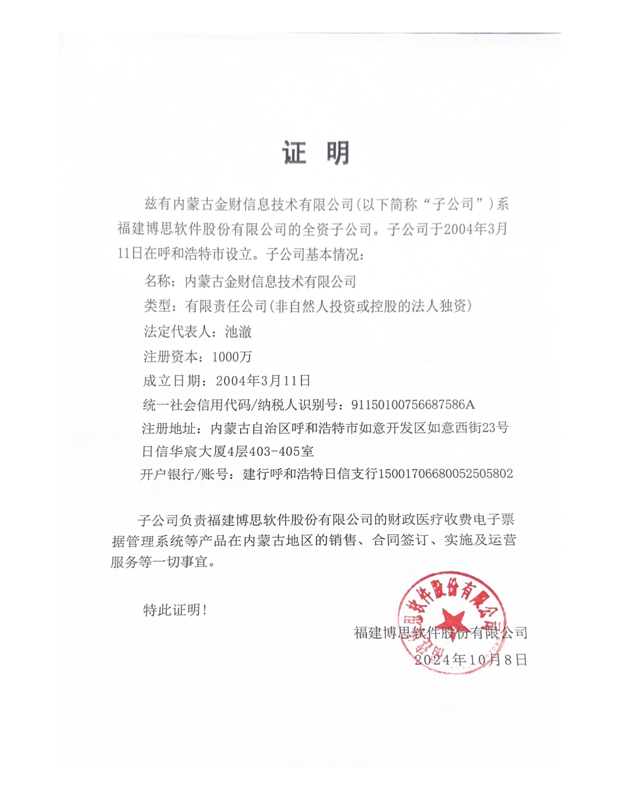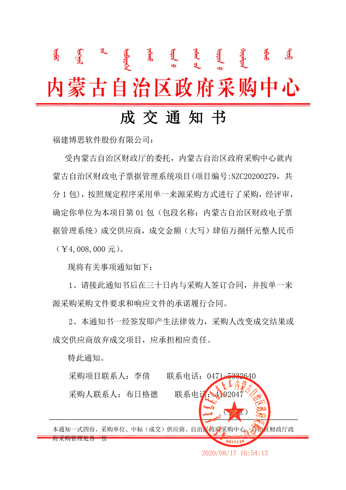 采用单一来源采购方式的原因及说明:根据内财综2021年724号文件,内蒙古自治区医疗收费电子票据管理改革项目单位为:福建博思软件股份有限公司。项目实施单位子公司(含授权证明)为:内蒙古金财信息技术有限公司,故采用单一来源方式。