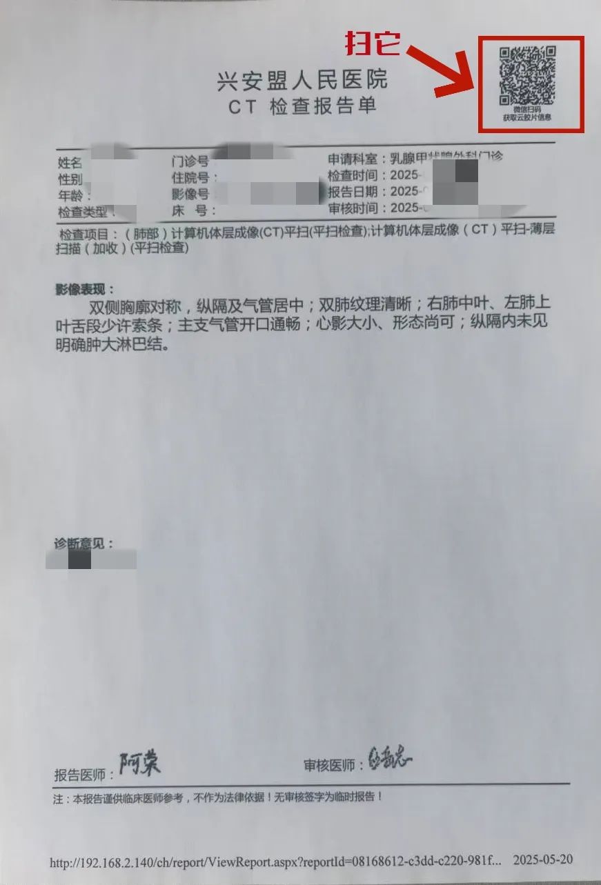 患者完成检查领取检查报告后,可通过微信扫一扫检查报告上的二维码,可查看“云胶片”,无需排队领取实体胶片,数字影像服务的普及应用,可减少患者胶片打印费用支出,更节约了患者就医的时间成本,同时践行低碳环保理念。云胶片成像质量满足同质化互认标准。