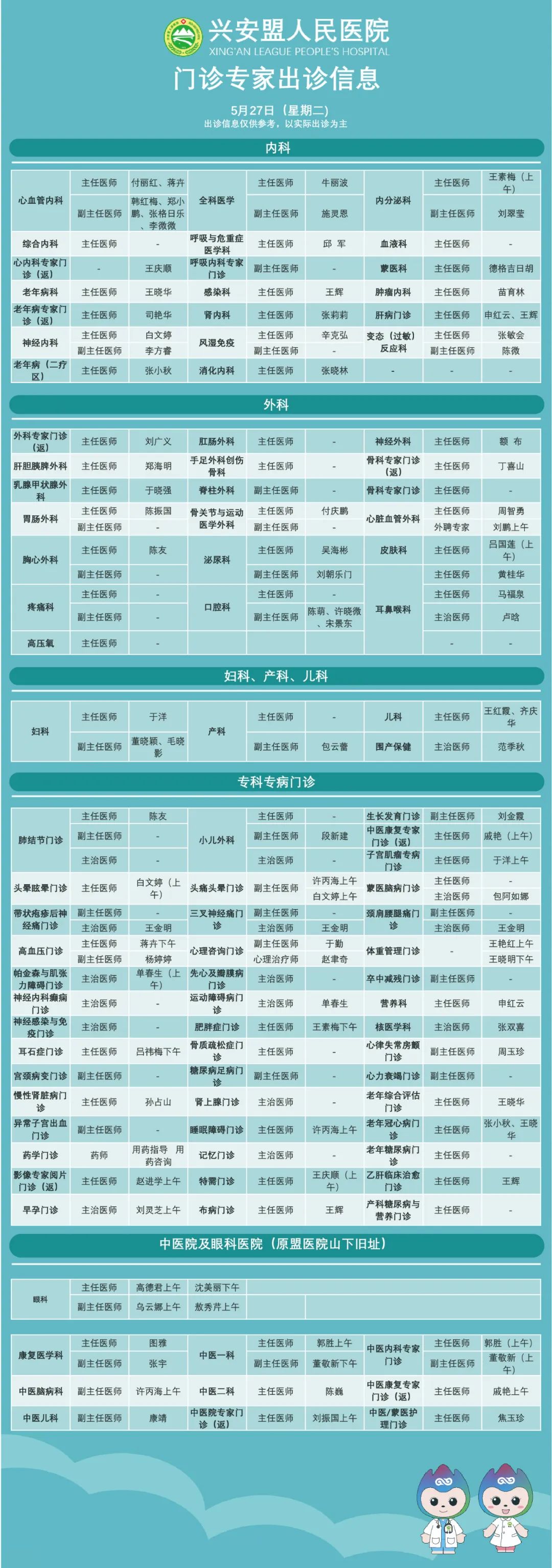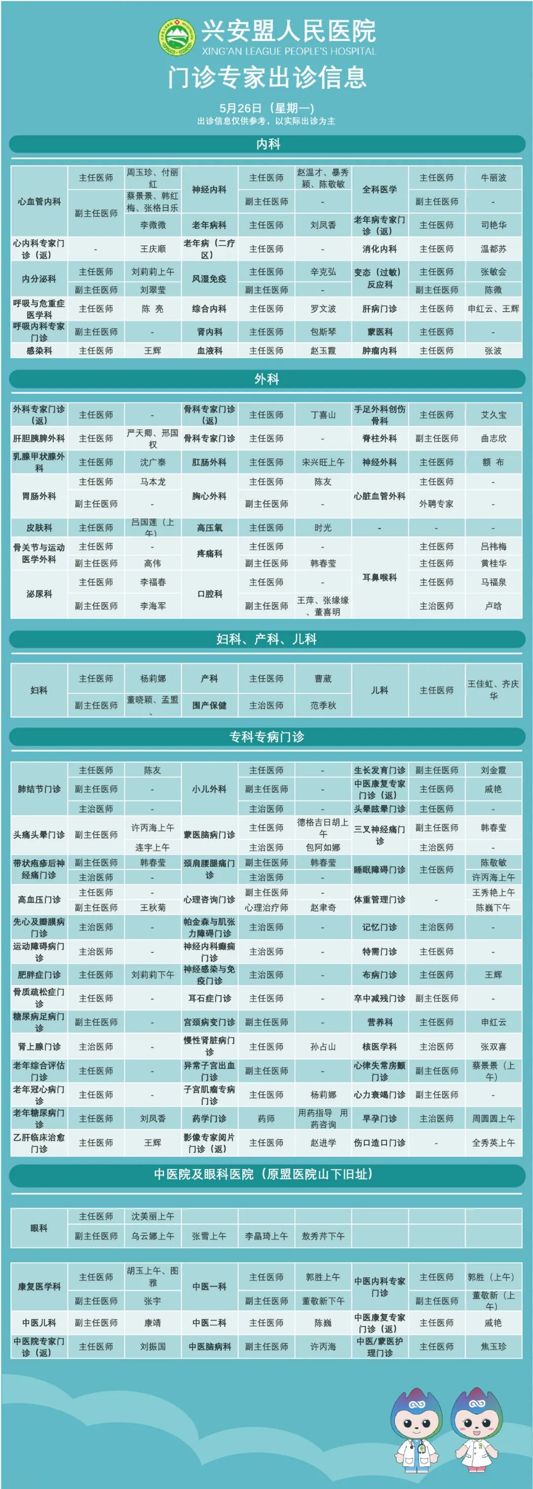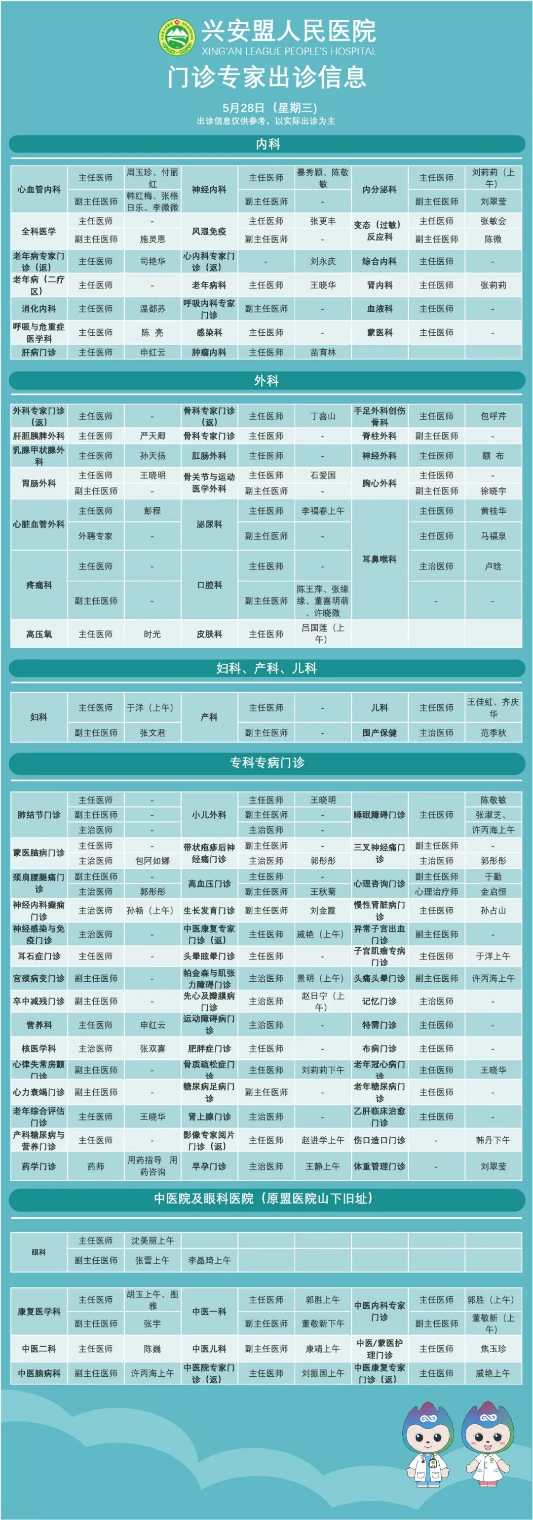 『出诊信息』兴安盟人民医院5月26 日-28 日出诊信息