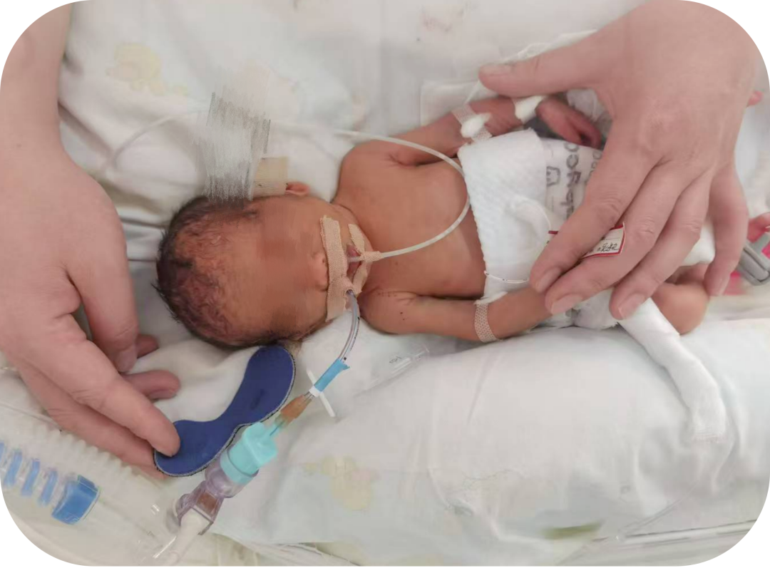 在四月平凡的一天,新生儿科来了一个胎龄29+2周,体重只有1029g的极低出生体重儿。这个小家伙也就护士的手掌那么大,当时病情危重,情况紧急,医生赶紧下达指令,气管插管、正压人工通气、胸外心脏按压、1:10000的肾上腺素从脐静脉缓慢推注,医护妈妈们争分夺秒的与死神艰难对抗,在日日夜夜守护中,小家伙用他与生俱来的生存本能,与医护妈妈们一起谱写了生命的奇迹,小小的他转危为安,慢慢的,病情稳定下来了。