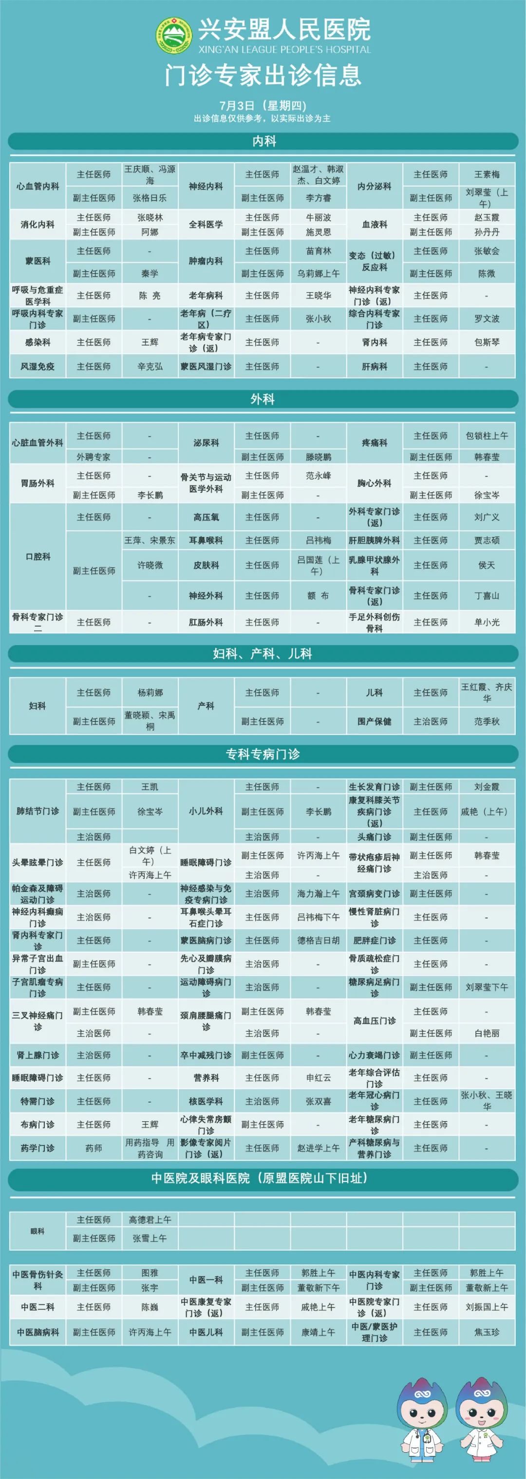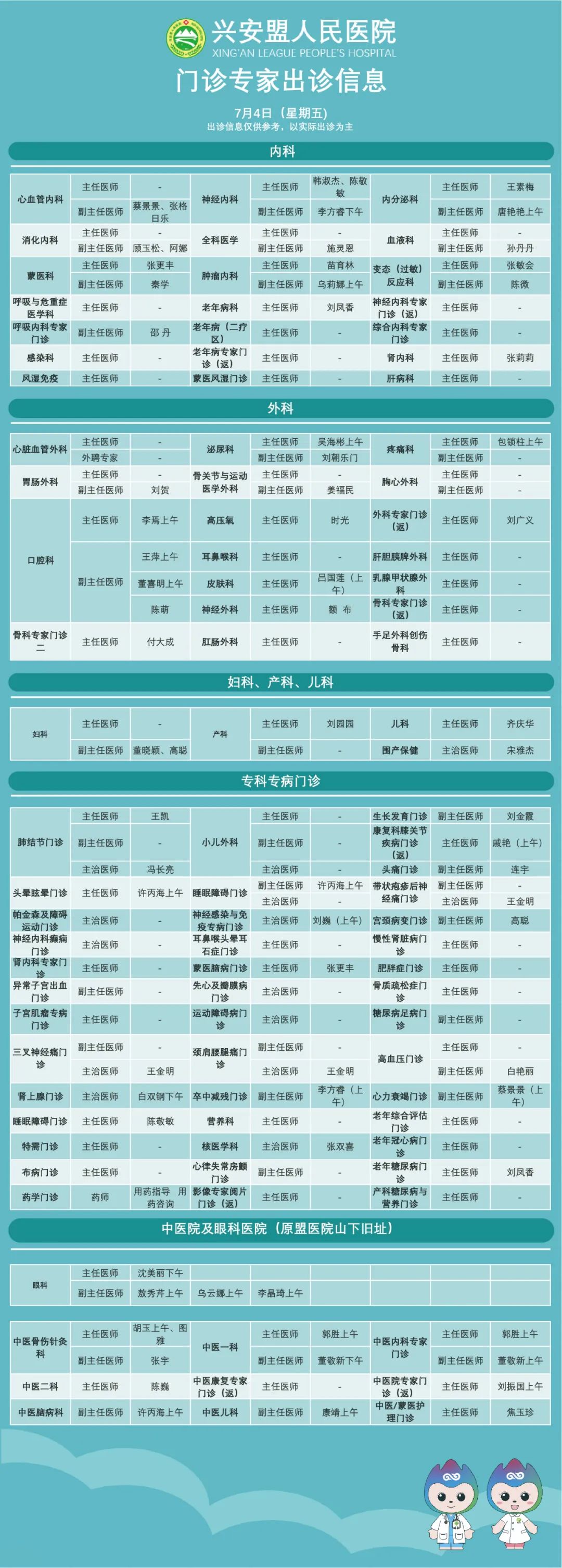 『出诊信息』兴安盟人民医院7月1日-2日出诊信息